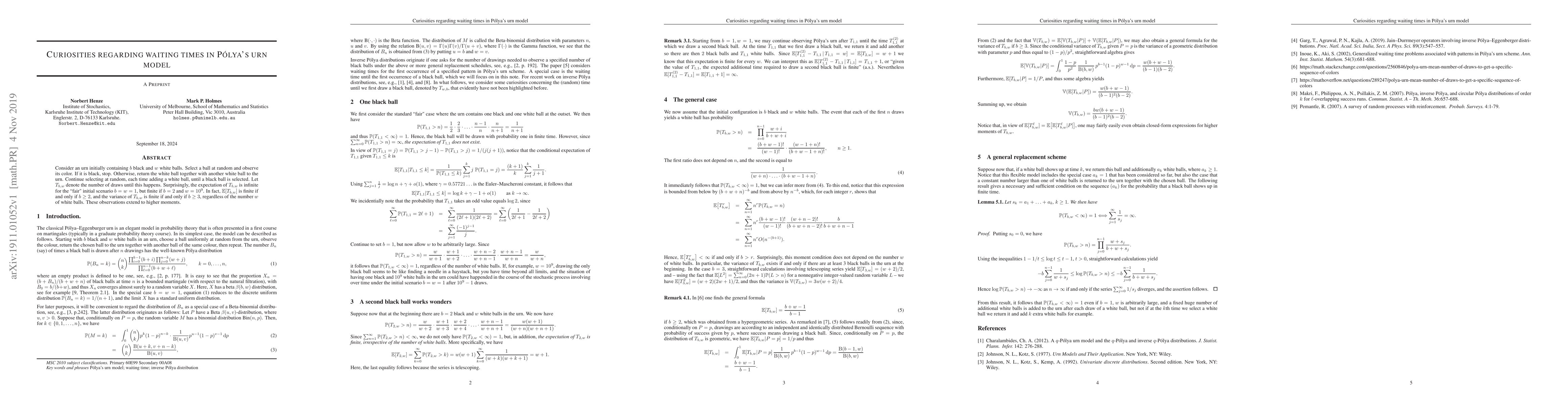 This paper explores P'{o}lya's urn model with initial black and white balls, finding that expected draws to stop (T_{b,w}) are infinite when b=w=1, but finite for b≥2. Variance is also finite only when b≥3, irrespective of w. These findings apply to higher moments too.