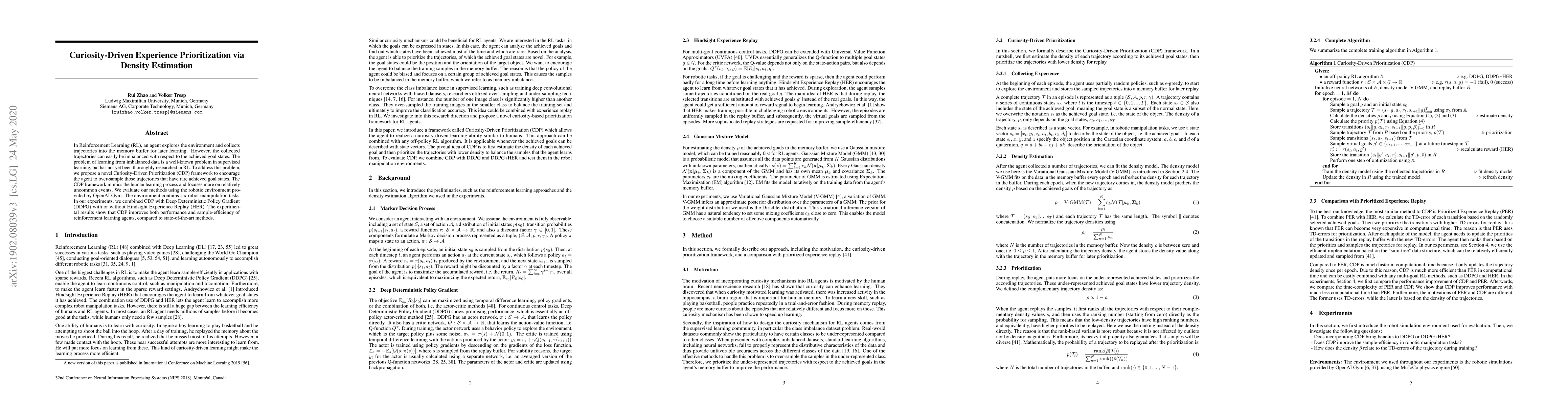 This paper proposes a Curiosity-Driven Prioritization (CDP) framework to address the issue of imbalanced data in Reinforcement Learning (RL) by encouraging the agent to explore rare goal states. Experiments in robotic manipulation tasks show that CDP enhances both the performance and sample-efficiency of RL agents when combined with Deep Deterministic Policy Gradient (DDPG) and Hindsight Experience Replay (HER).