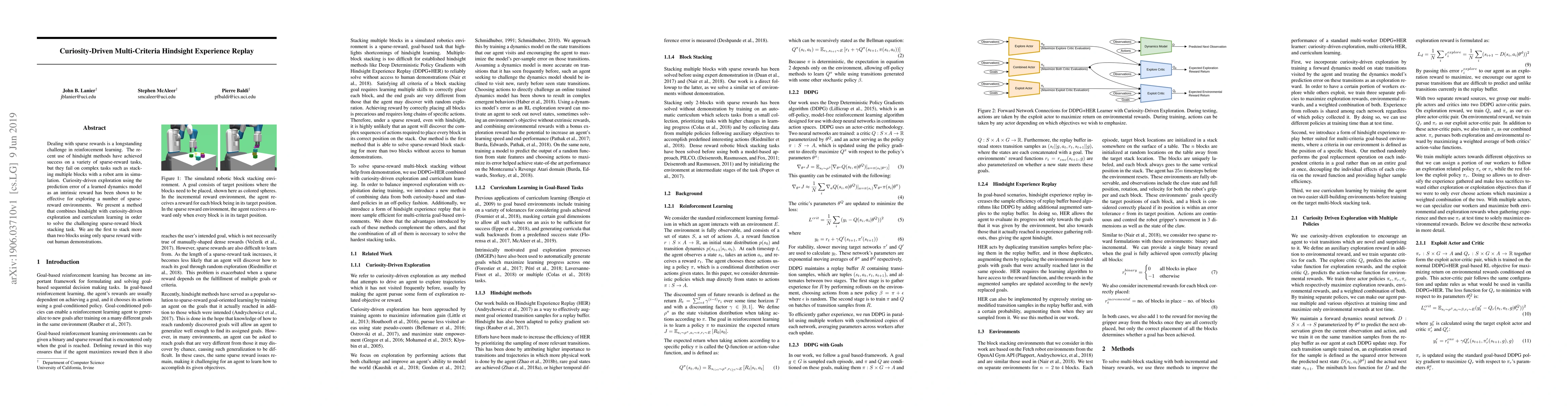 This paper introduces a novel method combining hindsight experience replay, curiosity-driven exploration, and curriculum learning to tackle the sparse-reward block stacking problem in simulated robot arms, achieving the first successful stacking of more than two blocks without human demonstrations.