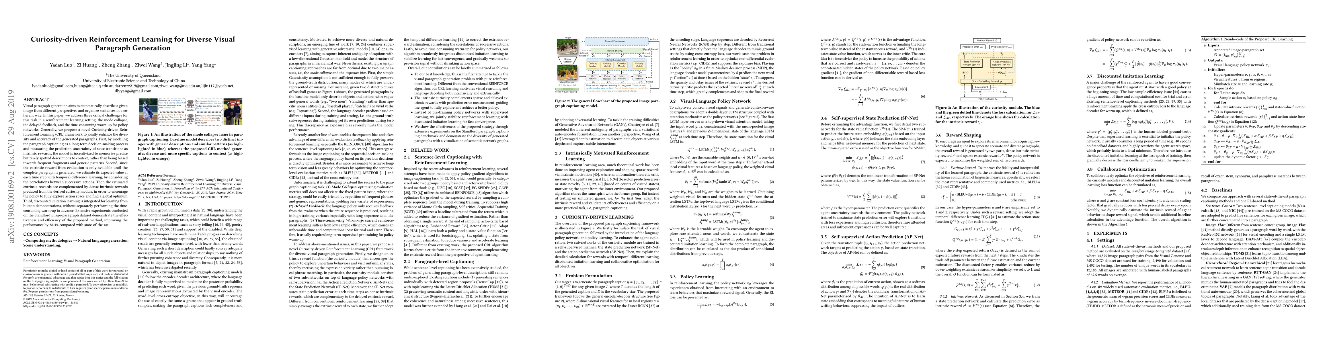 This paper proposes a Curiosity-driven Reinforcement Learning framework to generate diverse and coherent visual paragraphs by addressing mode collapse, delayed feedback, and warm-up issues. The method combines intrinsic rewards based on prediction uncertainty and extrinsic rewards estimated via temporal-difference learning, along with discounted imitation learning to enhance performance and efficiency.