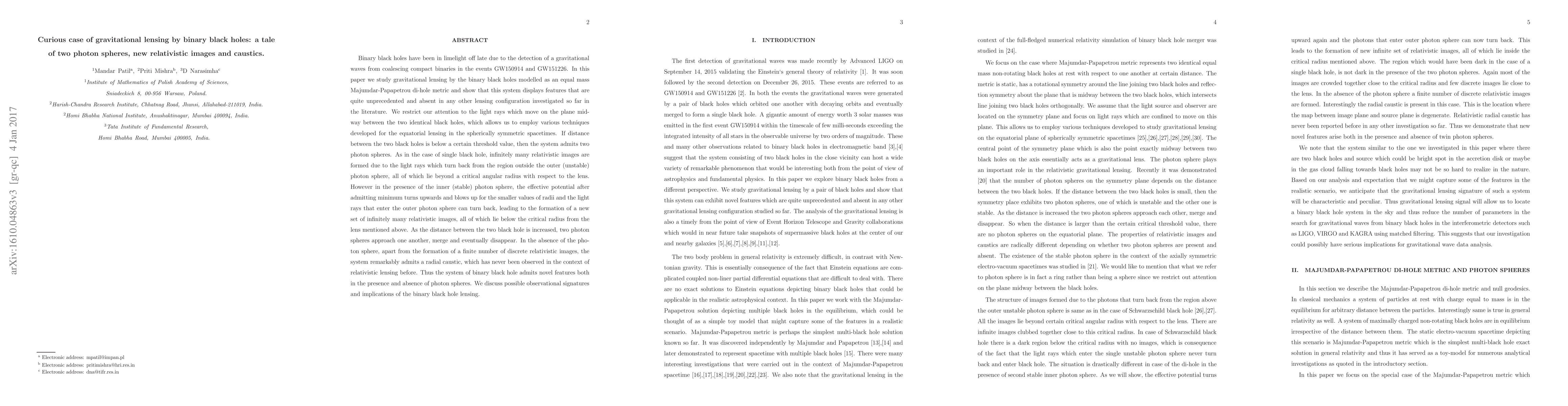 This paper investigates gravitational lensing by binary black holes using the Majumdar-Papapetrou dihole metric, revealing unprecedented features such as two photon spheres and new relativistic images. The study highlights novel observational signatures and implications of binary black hole lensing.