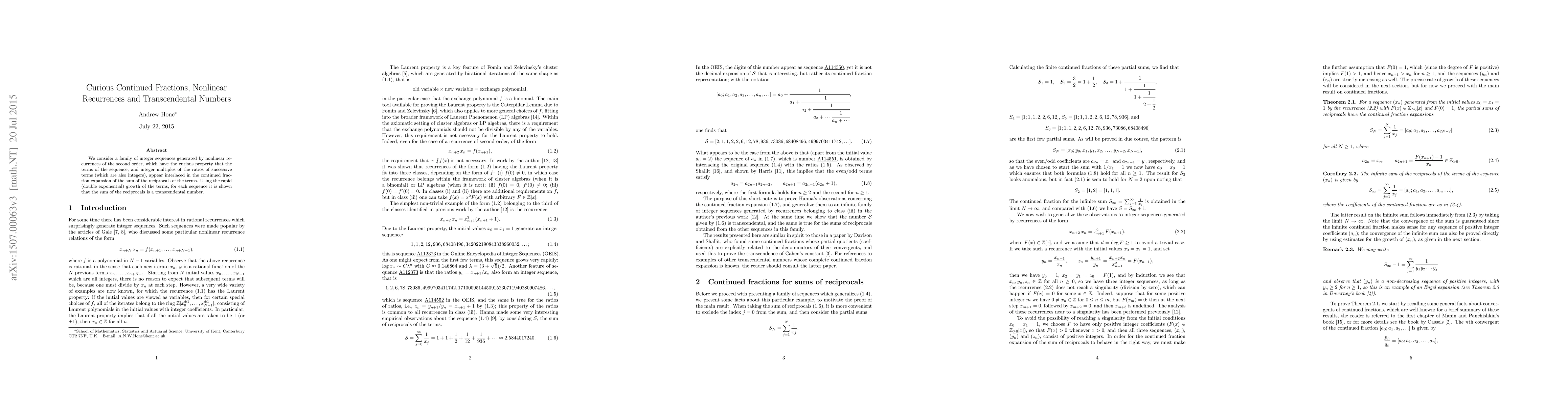 We consider a family of integer sequences generated by nonlinear recurrences of the second order, which have the curious property that the terms of the sequence, and integer multiples of the ratios of successive terms (which are also integers), appear interlaced in the continued fraction expansion of the sum of the reciprocals of the terms. Using the rapid (double exponential) growth of the terms, for each sequence it is shown that the sum of the reciprocals is a transcendental number.