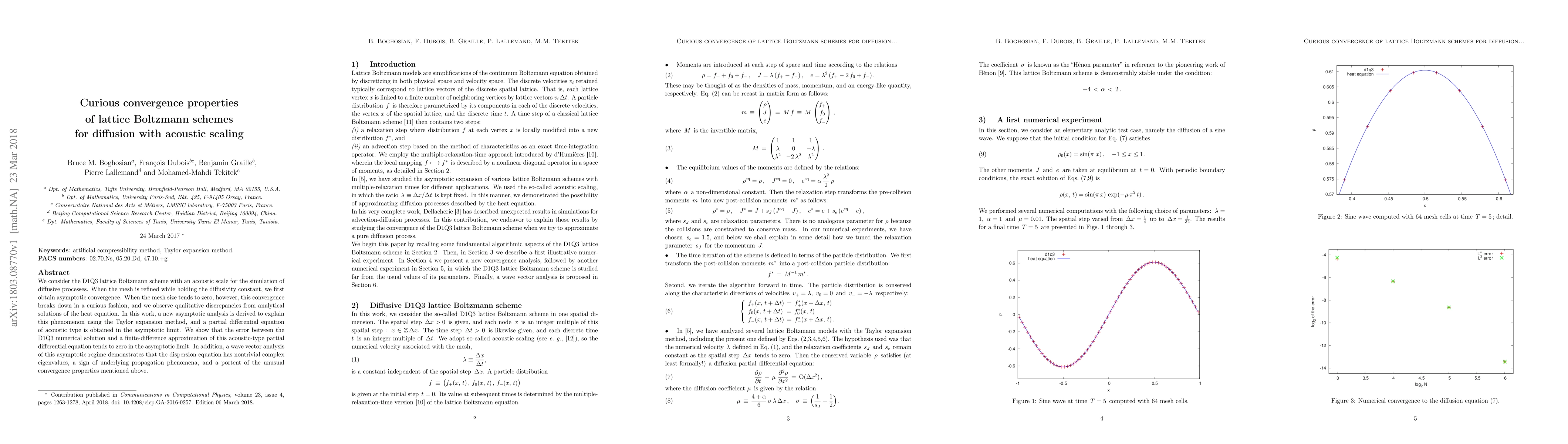 This paper investigates the D1Q3 lattice Boltzmann scheme for diffusive processes under acoustic scaling, revealing asymptotic convergence with mesh refinement. However, as mesh size approaches zero, convergence breaks down, leading to discrepancies with analytical solutions. The study derives a new asymptotic analysis explaining this behavior, showing that the numerical solution converges to an acoustic-type partial differential equation, with complex eigenvalues indicating underlying propagation phenomena.