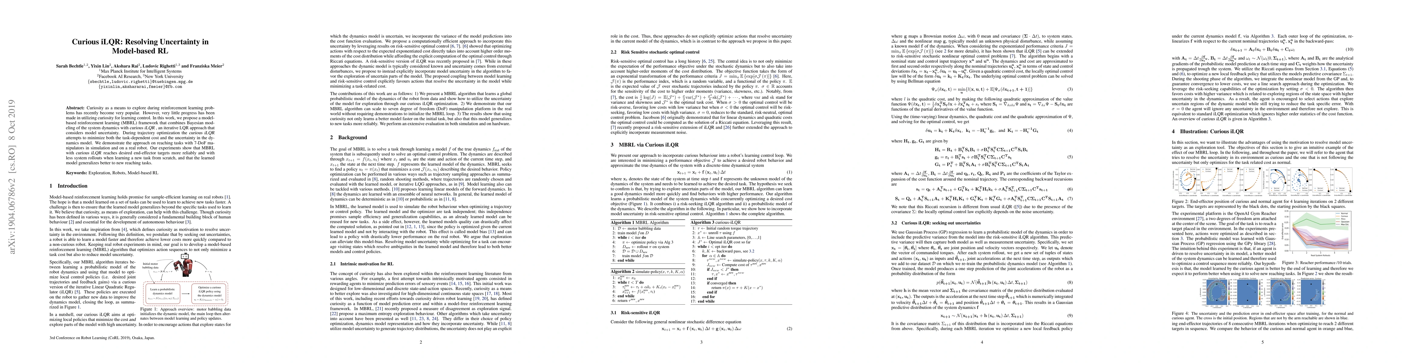 Curiosity as a means to explore during reinforcement learning problems has recently become very popular. However, very little progress has been made in utilizing curiosity for learning control. In this work, we propose a model-based reinforcement learning (MBRL) framework that combines Bayesian modeling of the system dynamics with curious iLQR, an iterative LQR approach that considers model uncertainty. During trajectory optimization the curious iLQR attempts to minimize both the task-dependent cost and the uncertainty in the dynamics model. We demonstrate the approach on reaching tasks with 7-DoF manipulators in simulation and on a real robot. Our experiments show that MBRL with curious iLQR reaches desired end-effector targets more reliably and with less system rollouts when learning a new task from scratch, and that the learned model generalizes better to new reaching tasks.