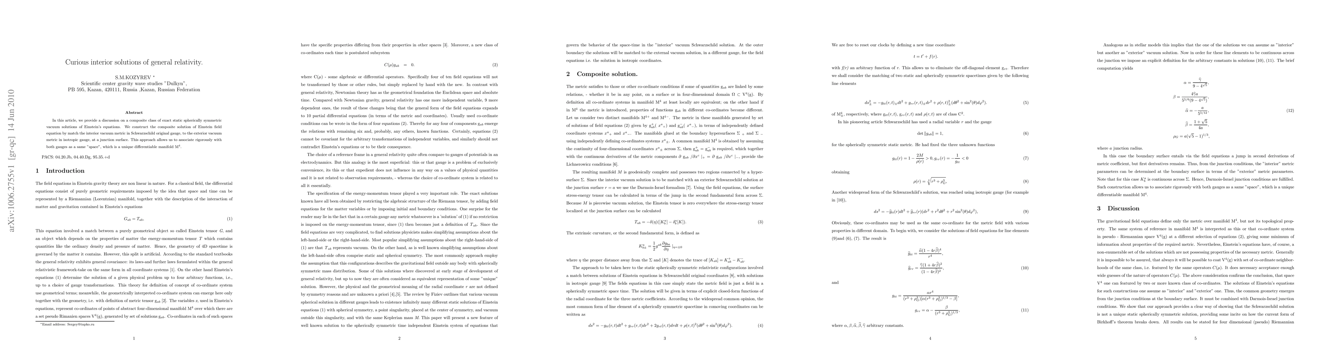 In this article, we provide a discussion on a composite class of exact static spherically symmetric vacuum solutions of Einstein's equations. We construct the composite solution of Einstein field equation by match the interior vacuum metric in Schwarzschild original gauge, to the exterior vacuum metric in isotropic gauge, at a junction surface. This approach allows us to associate rigorously with both gauges as a same "space", which is a unique differentiable manifold M^4