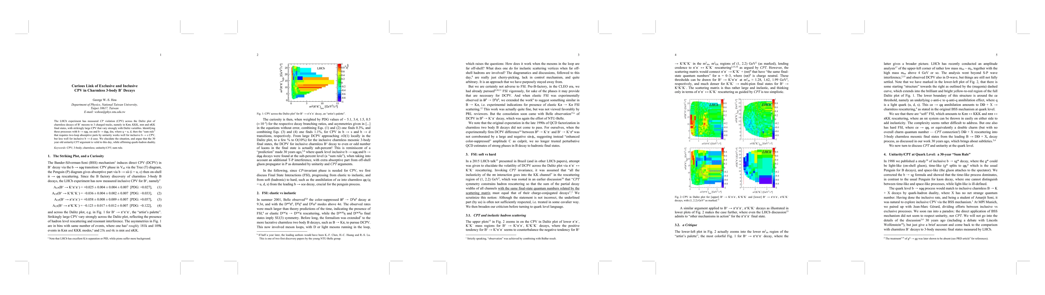 The LHCb experiment has measured CP violation (CPV) across the Dalitz plot of charmless decays of B+ mesons to 3 charged tracks, namely in K{\pi}{\pi}, KKK, {\pi}{\pi}{\pi} and {\pi}KK final states, with strikingly large CPV that vary strongly with Dalitz variables. Identifying these processes with b -> sqq(bar), sss(bar) and b -> dqq(bar), dss(bar), where q = u, d, then the "sum rule" that requires two-loop absorptive parts by unitarity works well for inclusive b -> s CPV, but less well for inclusive b -> d case. We elucidate the situation, and argue that the 30 year old unitarity/CPT argument is valid to this day, while affirming quark-hadron duality.