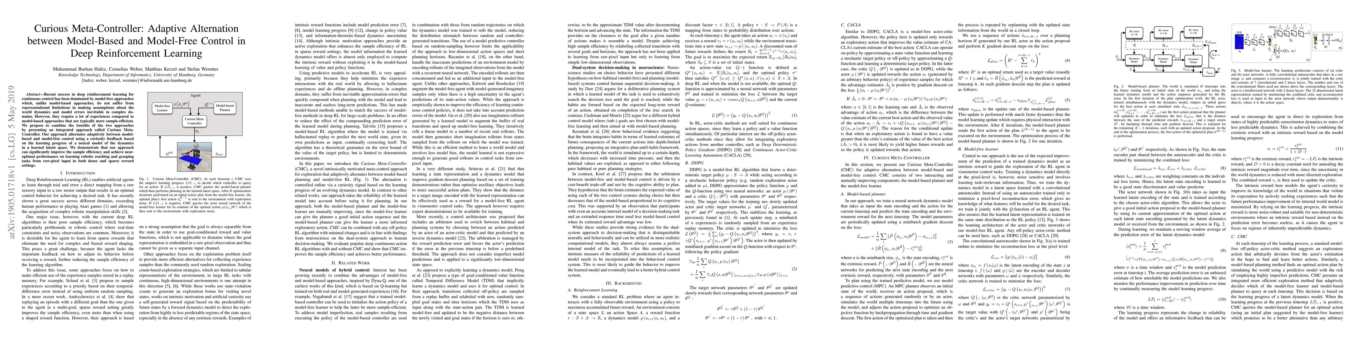 The Curious Meta-Controller adaptively alternates between model-based and model-free control in deep reinforcement learning, improving sample efficiency and achieving near-optimal performance on robotic reaching and grasping tasks. This integrated approach uses curiosity feedback to switch between the two methods based on the learning progress of a neural model.