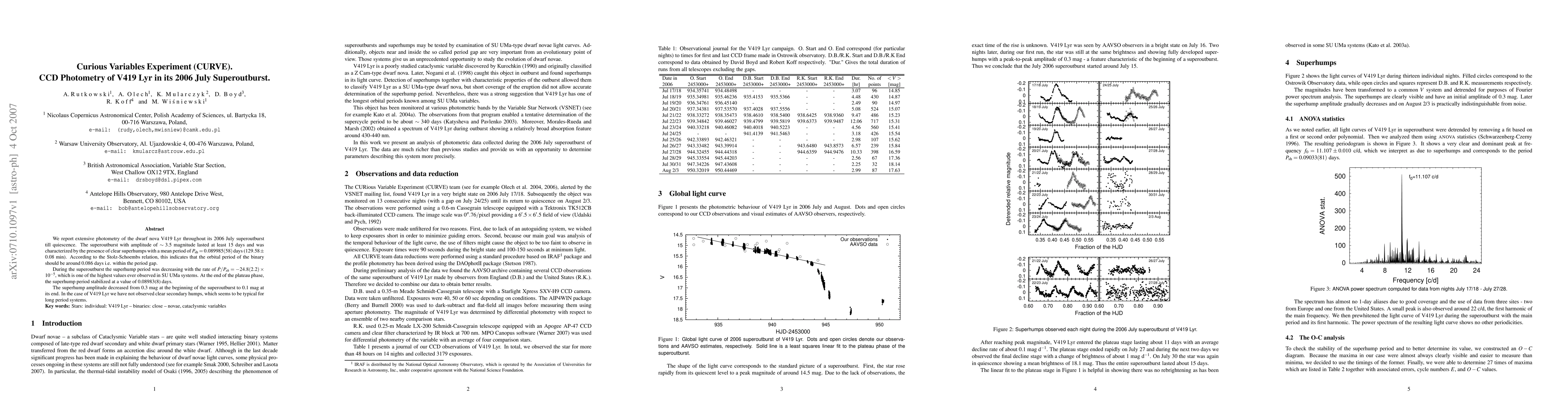 Researchers conducted extensive photometry of V419 Lyr during its 2006 July superoutburst, observing a 15-day event with clear superhumps and high dotP/Psh rate, providing insights into the system's orbital period and behavior.