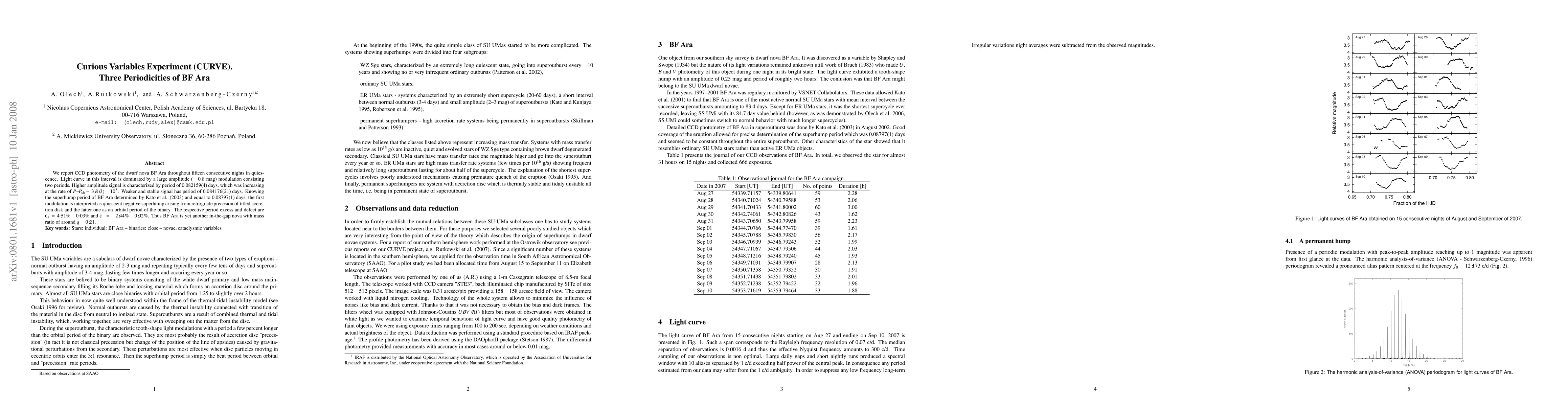 Astronomers studied dwarf nova BF Ara's light curve over 15 nights, discovering two periodic signals with periods of 0.082159 days and 0.084176 days, attributed to quiescent negative superhump and orbital period, respectively.