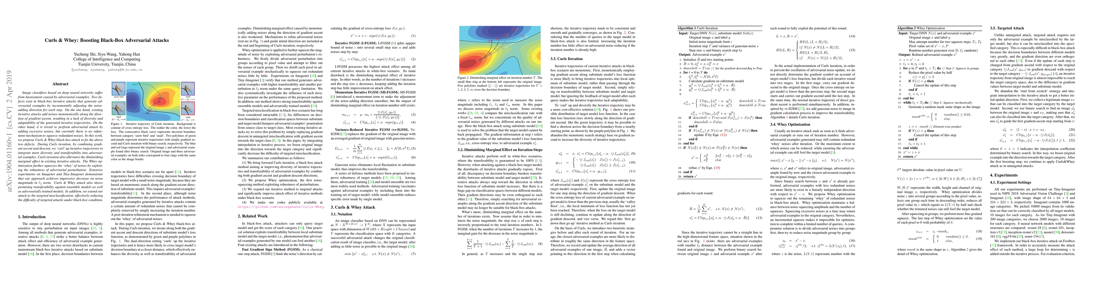 This paper proposes a new black-box adversarial attack called Curls & Whey to improve the diversity and effectiveness of generated adversarial examples. It addresses the lack of diversity in existing iterative attacks and the issue of excessive noise by introducing a dual-direction iterative method (Curls) and a noise refinement technique (Whey), resulting in more transferable and less noisy attacks.