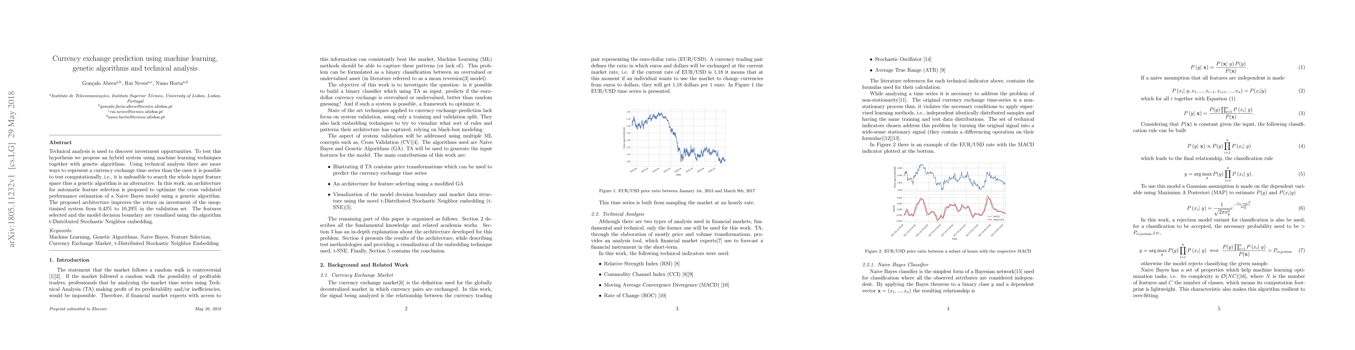 This paper proposes a hybrid system combining machine learning and genetic algorithms to predict currency exchange rates using technical analysis. The genetic algorithm optimizes feature selection for a Naive Bayes model, improving return on investment from 0.43% to 10.29% in the validation set.