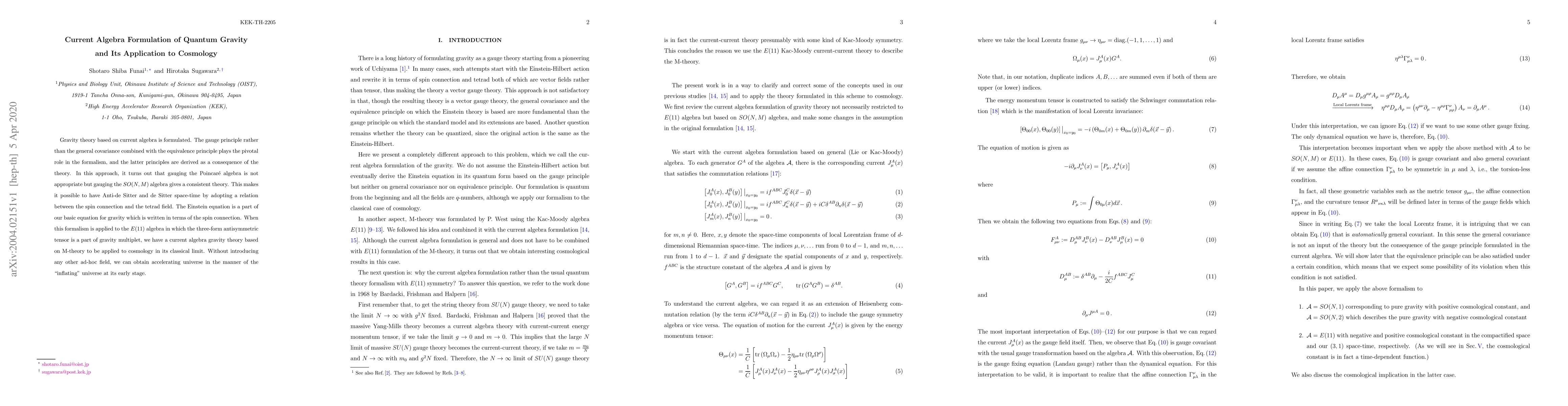 Gravity theory based on current algebra is formulated. The gauge principle rather than the general covariance combined with the equivalence principle plays the pivotal role in the formalism, and the latter principles are derived as a consequence of the theory. In this approach, it turns out that gauging the Poincar\'e algebra is not appropriate but gauging the $SO(N,M)$ algebra gives a consistent theory. This makes it possible to have Anti-de Sitter and de Sitter space-time by adopting a relation between the spin connection and the tetrad field. The Einstein equation is a part of our basic equation for gravity which is written in terms of the spin connection. When this formalism is applied to the $E(11)$ algebra in which the three-form antisymmetric tensor is a part of gravity multiplet, we have a current algebra gravity theory based on M-theory to be applied to cosmology in its classical limit. Without introducing any other ad-hoc field, we can obtain accelerating universe in the manner of the "inflating" universe at its early stage.