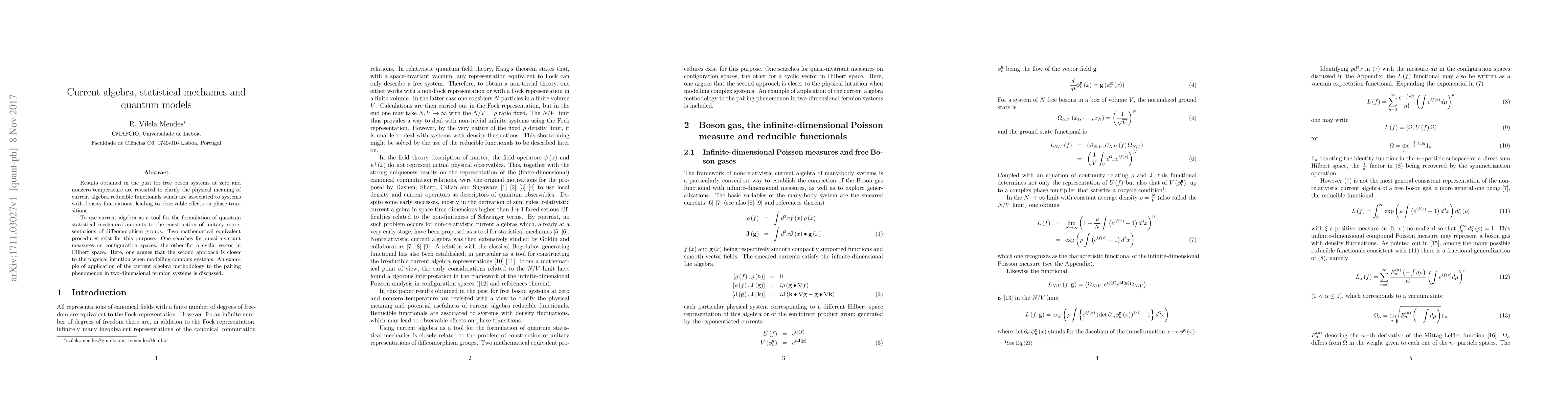 Results obtained in the past for free boson systems at zero and nonzero temperature are revisited to clarify the physical meaning of current algebra reducible functionals which are associated to systems with density fluctuations, leading to observable effects on phase transitions. To use current algebra as a tool for the formulation of quantum statistical mechanics amounts to the construction of unitary representations of diffeomorphism groups. Two mathematical equivalent procedures exist for this purpose. One searches for quasi-invariant measures on configuration spaces, the other for a cyclic vector in Hilbert space. Here, one argues that the second approach is closer to the physical intuition when modelling complex systems. An example of application of the current algebra methodology to the pairing phenomenon in two-dimensional fermion systems is discussed.