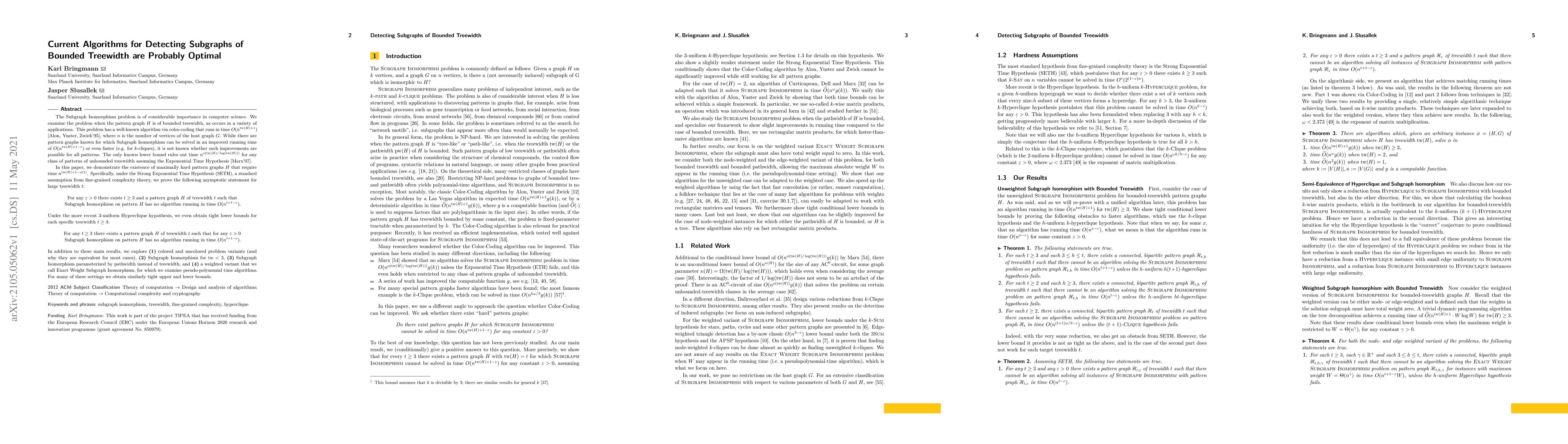 This paper argues that current algorithms for detecting subgraphs of bounded treewidth in the Subgraph Isomorphism problem are likely optimal under complexity assumptions like the Strong Exponential Time Hypothesis (SETH). It establishes tight lower bounds for Subgraph Isomorphism on pattern graphs of bounded treewidth, showing no algorithms can run faster than $O(n^{tw(H)+1-\varepsilon})$ for large treewidths.