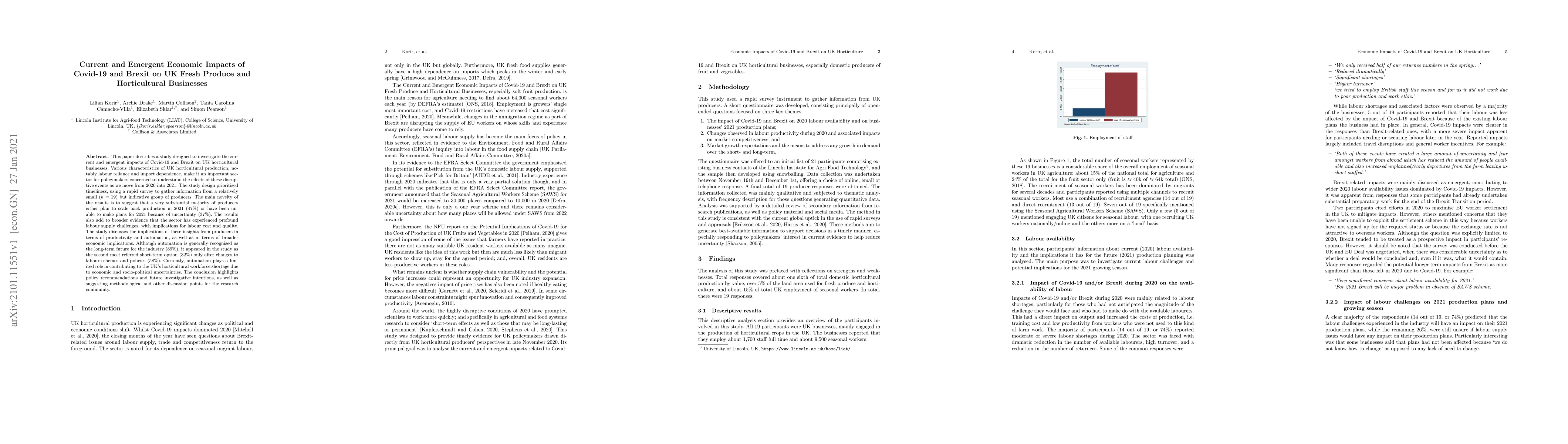This study investigates the economic impacts of Covid-19 and Brexit on UK horticultural businesses, revealing that most producers plan to scale back or are uncertain about 2021 production due to profound labour supply challenges. The findings suggest that while automation is seen as the long-term solution, immediate changes to labour schemes and policies are prioritized over automation due to current economic uncertainties.