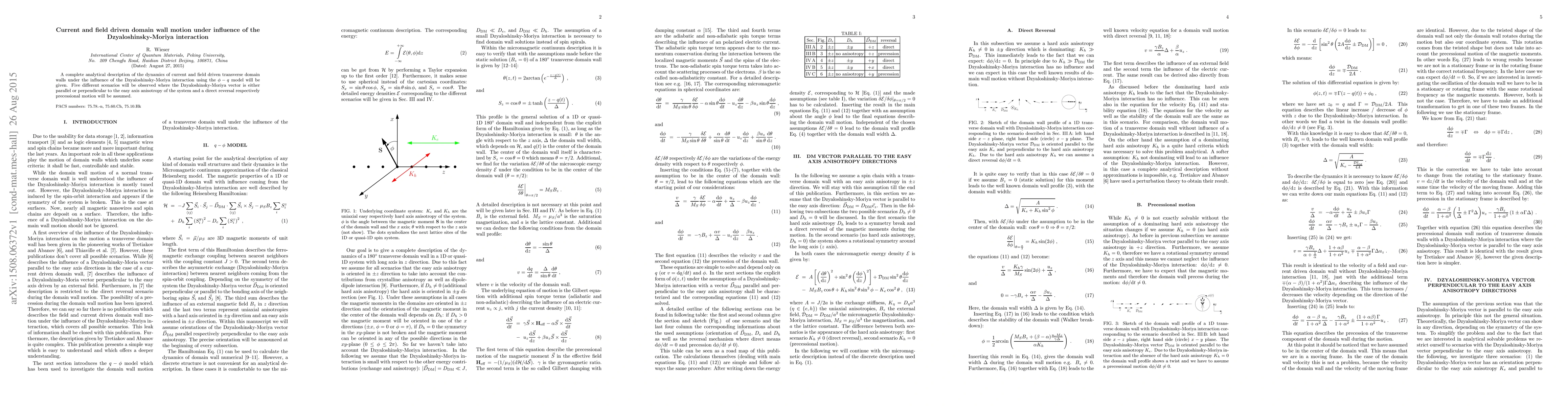 A complete analytical description of the dynamics of current and field driven transverse domain walls under the influence of the Dzyaloshinsky-Moriya interaction using the $\phi - q$ model will be given. Five different scenarios will be observed where the Dzyaloshinsky-Moriya vector is either parallel or perpendicular to the easy axis anisotropy of the system and a direct reversal respectively precessional motion will be assumed.