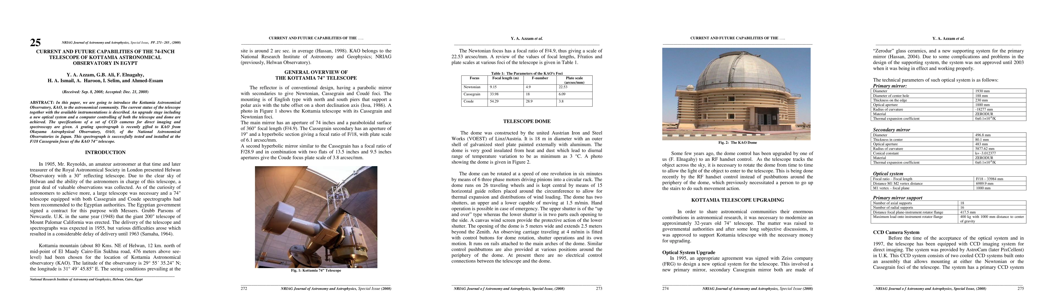 This paper introduces the Kottamia Astronomical Observatory's 74-inch telescope, detailing its current instrumentation and an upgrade plan including a new optical system and computer control. A recently gifted grating spectrograph from Japan has been successfully installed and tested.