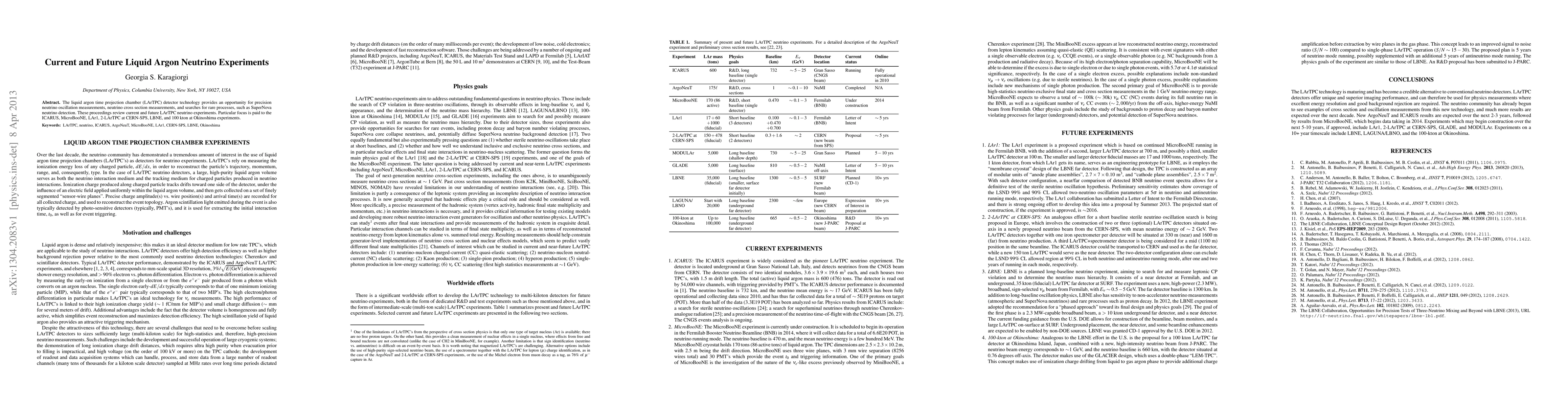 The liquid argon time projection chamber (LArTPC) detector technology provides an opportunity for precision neutrino oscillation measurements, neutrino cross section measurements, and searches for rare processes, such as SuperNova neutrino detection. These proceedings review current and future LArTPC neutrino experiments. Particular focus is paid to the ICARUS, MicroBooNE, LAr1, 2-LArTPC at CERN-SPS, LBNE, and 100 kton at Okinoshima experiments.