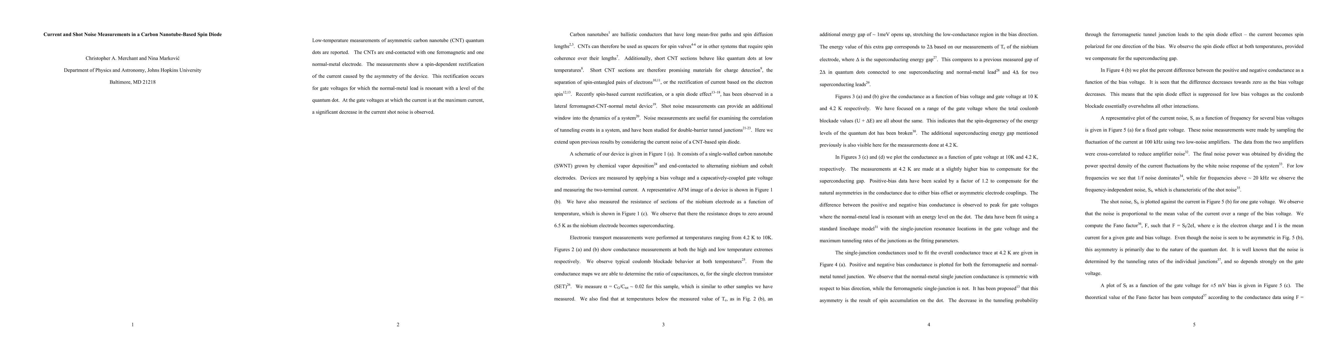 This paper reports low-temperature measurements of a carbon nanotube-based spin diode, showing spin-dependent current rectification due to device asymmetry. Notably, a significant reduction in current shot noise is observed at maximum current gate voltages.
