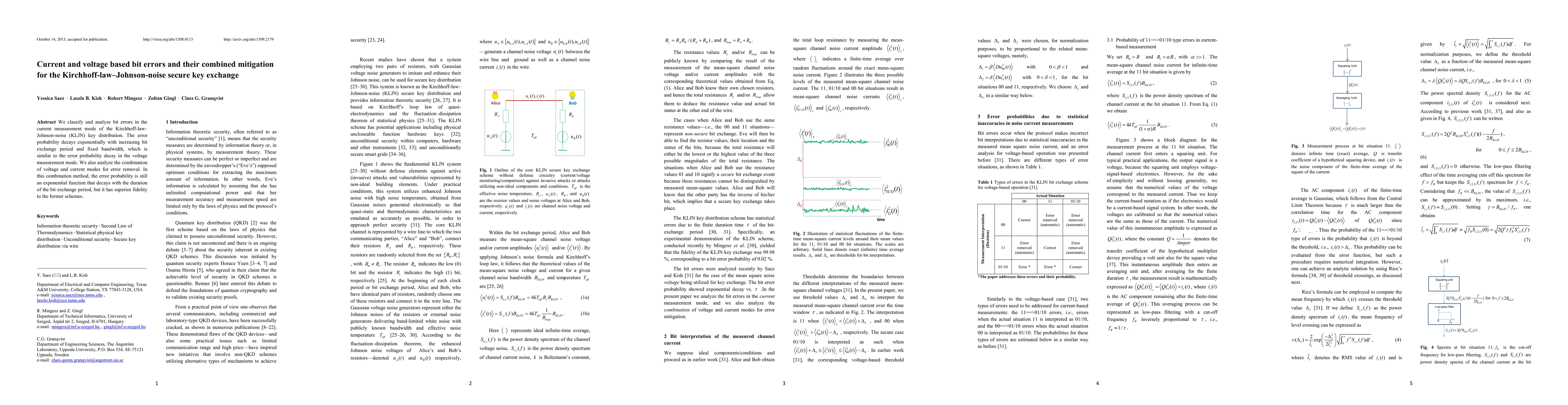 This paper classifies and analyzes bit errors in the current and voltage measurement modes of the Kirchhoff-law-Johnson-noise key distribution, showing exponential decay in error probability with longer bit exchange periods. It proposes a combined voltage-current method that maintains exponential decay but offers superior fidelity over individual modes.