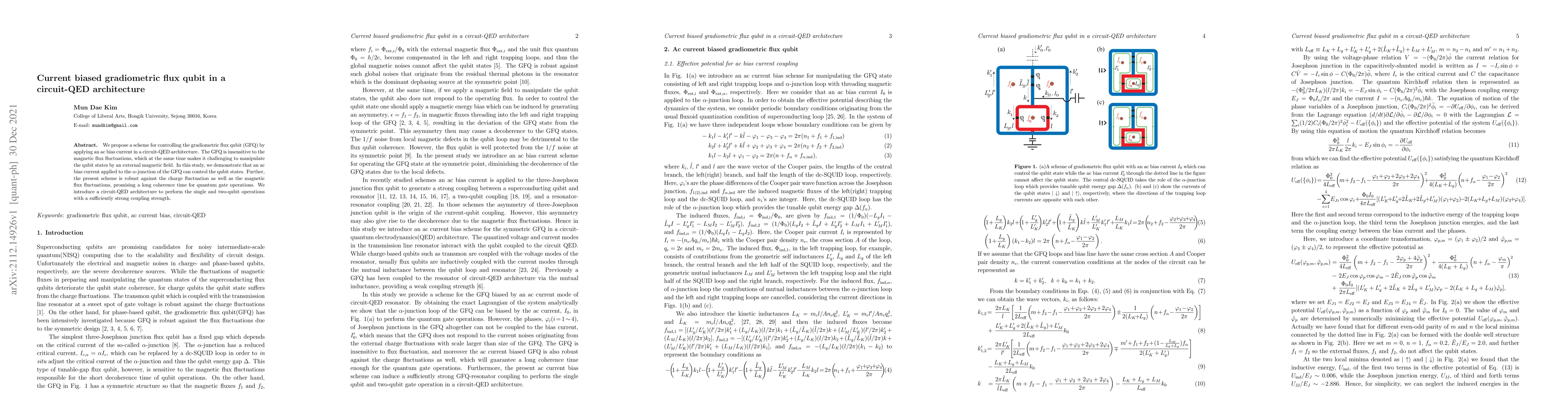 We propose a scheme for controlling the gradiometric flux qubit (GFQ) by applying an ac bias current in a circuit-QED architecture. The GFQ is insensitive to the magnetic flux fluctuations, which at the same time makes it challenging to manipulate the qubit states by an external magnetic field. In this study, we demonstrate that an ac bias current applied to the $\alpha$-junction of the GFQ can control the qubit states. Further, the present scheme is robust against the charge fluctuation as well as the magnetic flux fluctuations, promising a long coherence time for quantum gate operations. We introduce a circuit-QED architecture to perform the single and two-qubit operations with a sufficiently strong coupling strength.