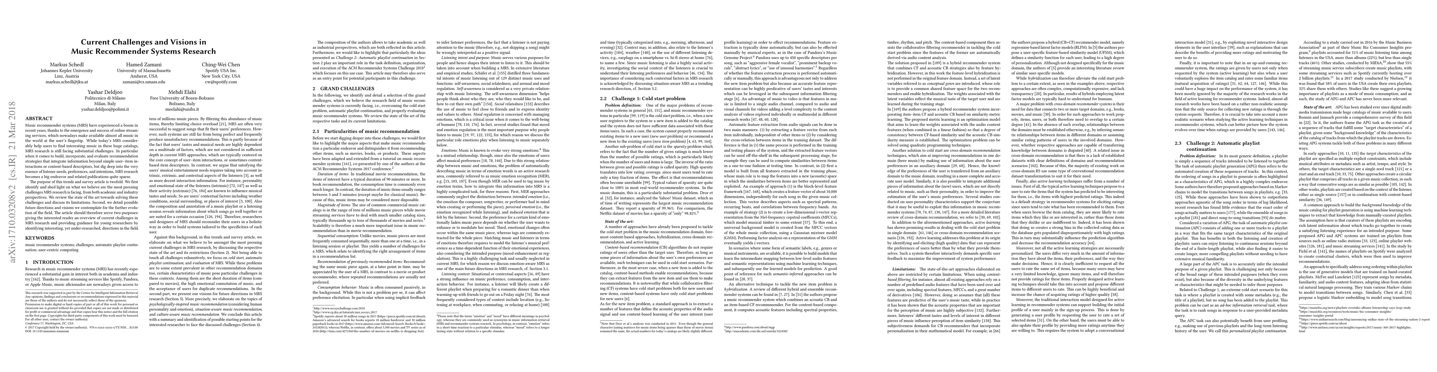 Music recommender systems (MRS) have experienced a boom in recent years, thanks to the emergence and success of online streaming services, which nowadays make available almost all music in the world at the user's fingertip. While today's MRS considerably help users to find interesting music in these huge catalogs, MRS research is still facing substantial challenges. In particular when it comes to build, incorporate, and evaluate recommendation strategies that integrate information beyond simple user--item interactions or content-based descriptors, but dig deep into the very essence of listener needs, preferences, and intentions, MRS research becomes a big endeavor and related publications quite sparse. The purpose of this trends and survey article is twofold. We first identify and shed light on what we believe are the most pressing challenges MRS research is facing, from both academic and industry perspectives. We review the state of the art towards solving these challenges and discuss its limitations. Second, we detail possible future directions and visions we contemplate for the further evolution of the field. The article should therefore serve two purposes: giving the interested reader an overview of current challenges in MRS research and providing guidance for young researchers by identifying interesting, yet under-researched, directions in the field.