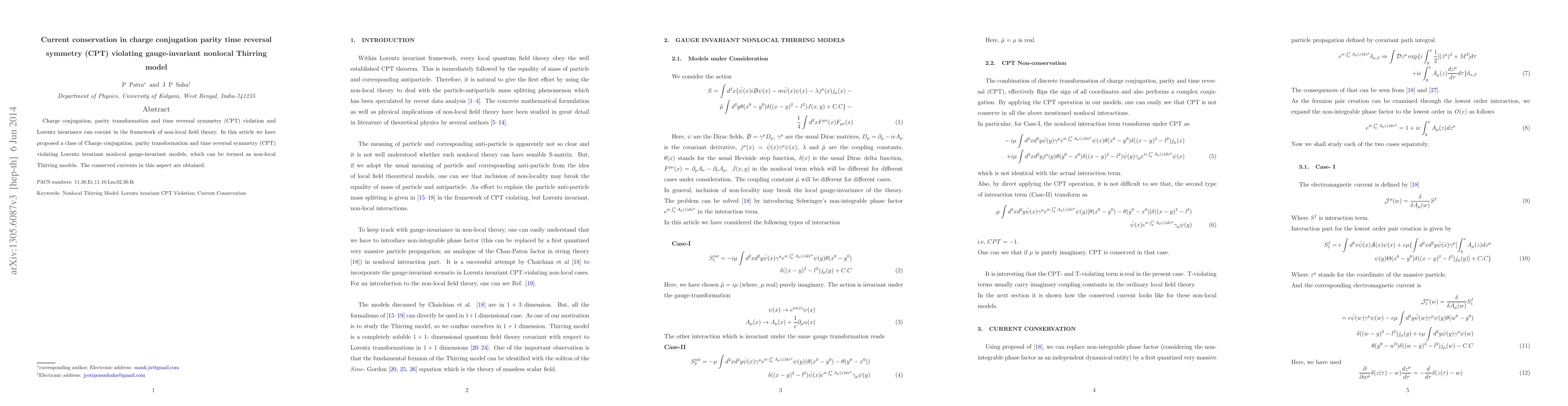 This paper proposes a class of non-local gauge-invariant Thirring models that violate charge conjugation, parity, and time reversal symmetry (CPT) while maintaining Lorentz invariance. The study identifies conserved currents within these models.