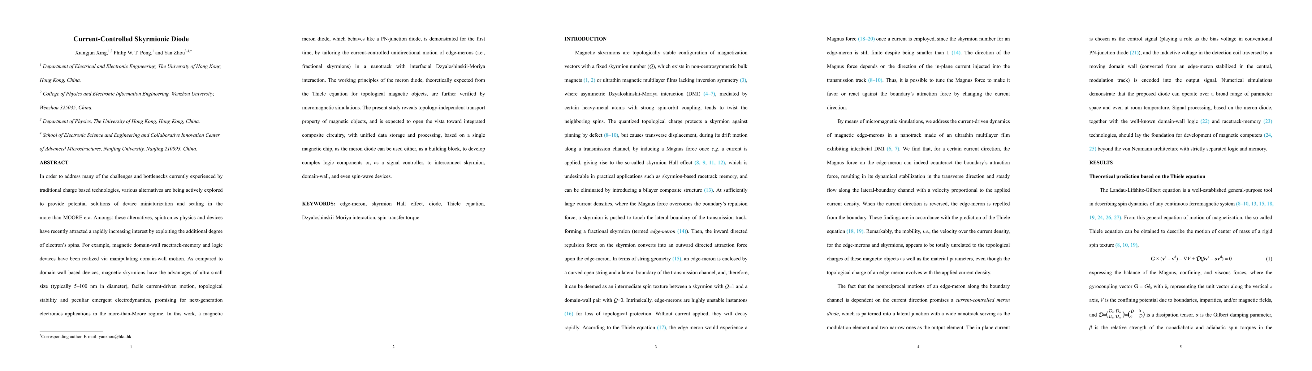 This paper demonstrates the first current-controlled skyrmionic diode, utilizing edge-merons in a nanotrack with Dzyaloshinskii-Moriya interaction, showcasing unidirectional motion akin to a PN-junction diode. The study suggests potential for integrated composite circuitry combining data storage and processing on a single magnetic chip.
