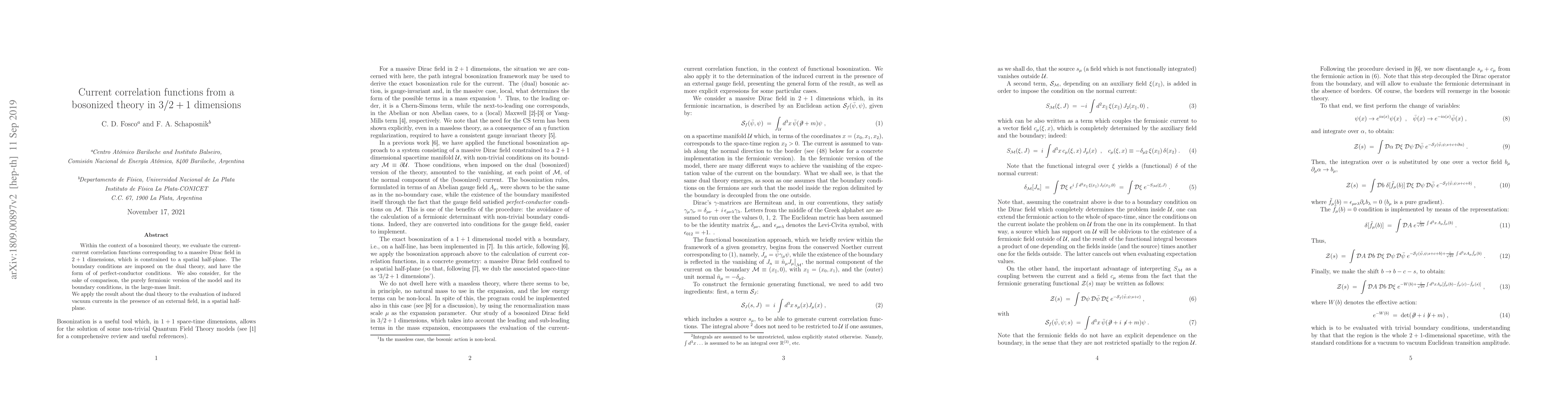 Within the context of a bosonized theory, we evaluate the current-current correlation functions corresponding to a massive Dirac field in 2+1 dimensions, which is constrained to a spatial half-plane. We apply the result to the evaluation of induced vacuum currents in the presence of an external field. We comment on the relation with the purely fermionic version of the model, in the large-mass limit.