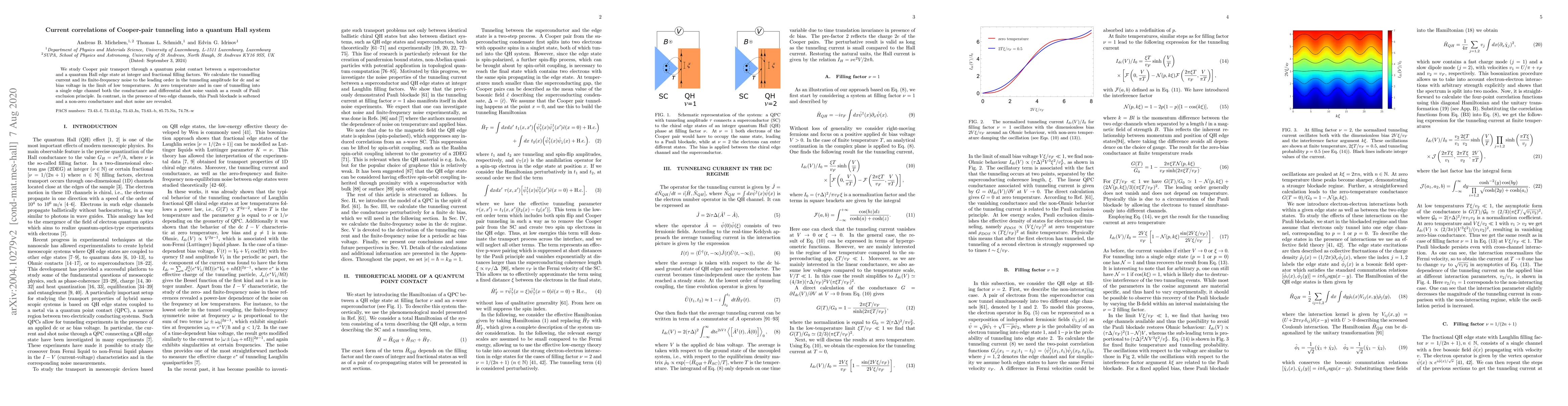 This paper investigates Cooper pair tunneling between a superconductor and a quantum Hall edge state, revealing that single-channel tunneling results in zero conductance and noise due to the Pauli exclusion principle, while dual-channel tunneling allows for non-zero conductance and shot noise.