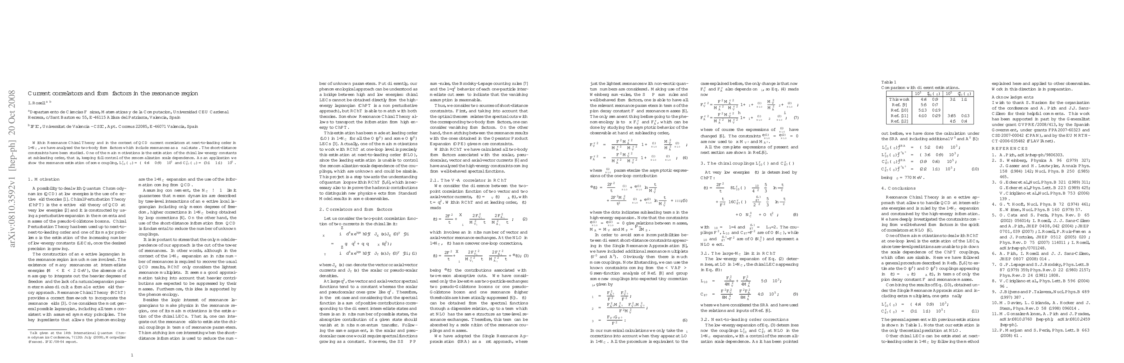 Within Resonance Chiral Theory and in the context of QCD current correlators at next-to-leading order in 1/N(C), we have analyzed the two-body form factors which include resonances as a final state . The short-distance constraints have been studied. One of the main motivations is the estimation of the chiral low-energy constants at subleading order, that is, keeping full control of the renormalization scale dependence. As an application we show the resonance estimation of some coupling, L(10)(mu_0)=(-4.4 \pm 0.9)10^{-3} and C(87)(mu_0)=(3.1 \pm 1.1)10^{-5}.