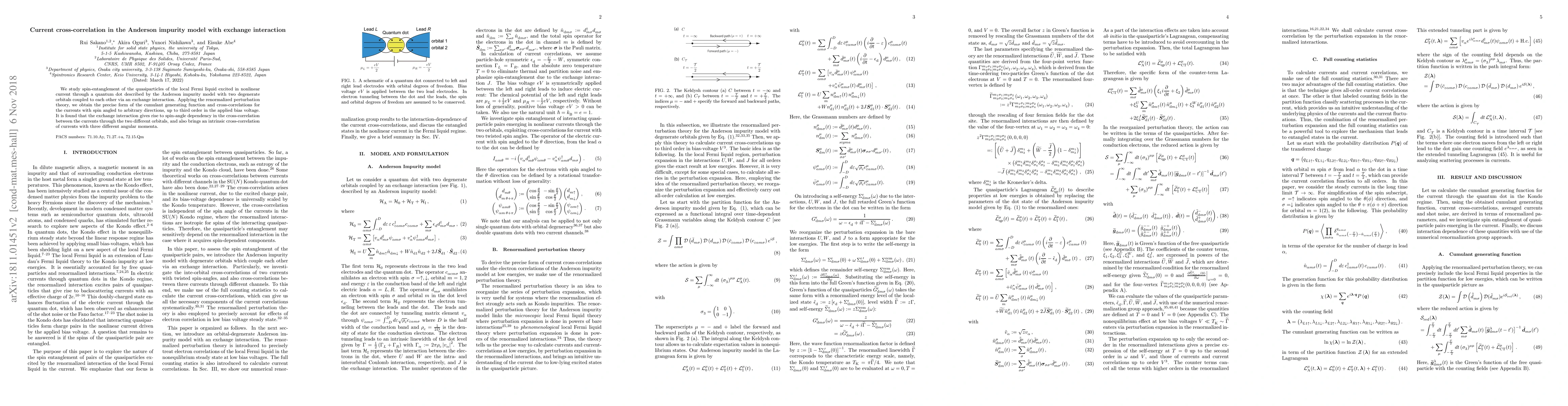 This research paper studies the spin-entanglement of quasiparticles in an Anderson impurity model with exchange interaction, finding that the exchange interaction introduces spin-angle dependency and intrinsic cross-correlation between currents with different angular momenta.