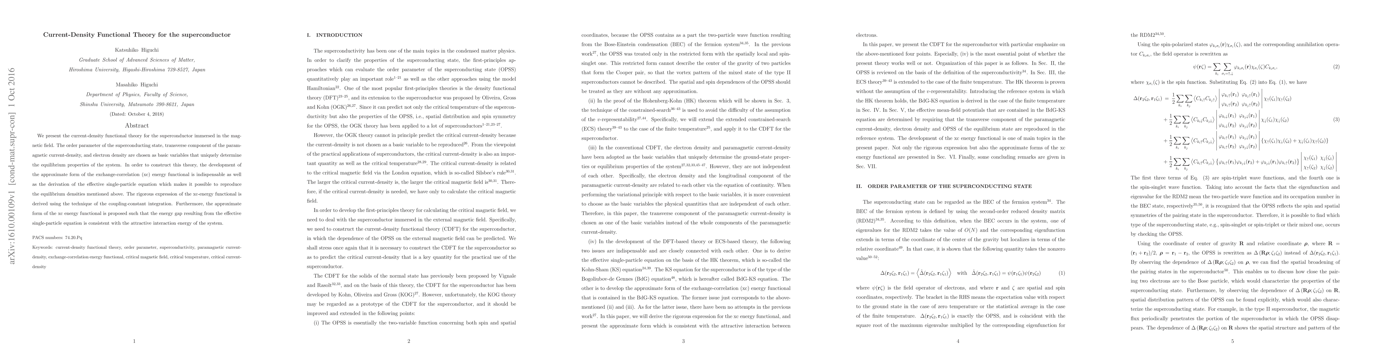 We present the current-density functional theory for the superconductor immersed in the magnetic field. The order parameter of the superconducting state, transverse component of the paramagnetic current-density, and electron density are chosen as basic variables that uniquely determine the equilibrium properties of the system. In order to construct this theory, the development of the approximate form of the exchange-correlation (xc) energy functional is indispensable as well as the derivation of the effective single-particle equation which makes it possible to reproduce the equilibrium densities mentioned above. The rigorous expression of the xc-energy functional is derived using the technique of the coupling-constant integration. Furthermore, the approximate form of the xc energy functional is proposed such that the energy gap resulting from the effective single-particle equation is consistent with the attractive interaction energy of the system.