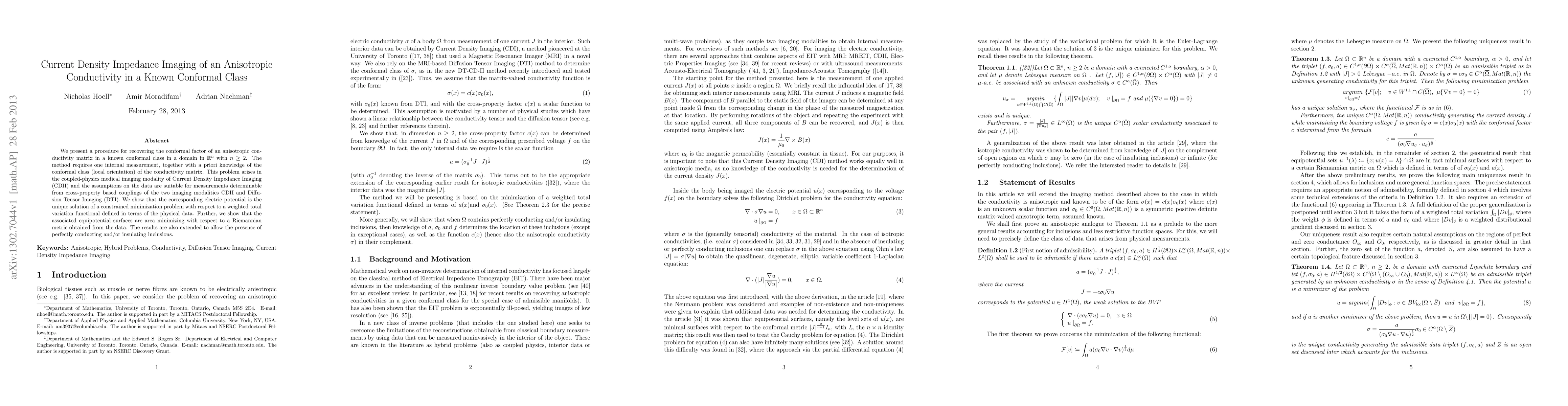 Researchers developed a method to recover anisotropic conductivity matrices in known conformal classes using internal measurements and prior knowledge of the class. This allows for accurate medical imaging in modalities like Current Density Impedance Imaging (CDII) and Diffusion Tensor Imaging (DTI).