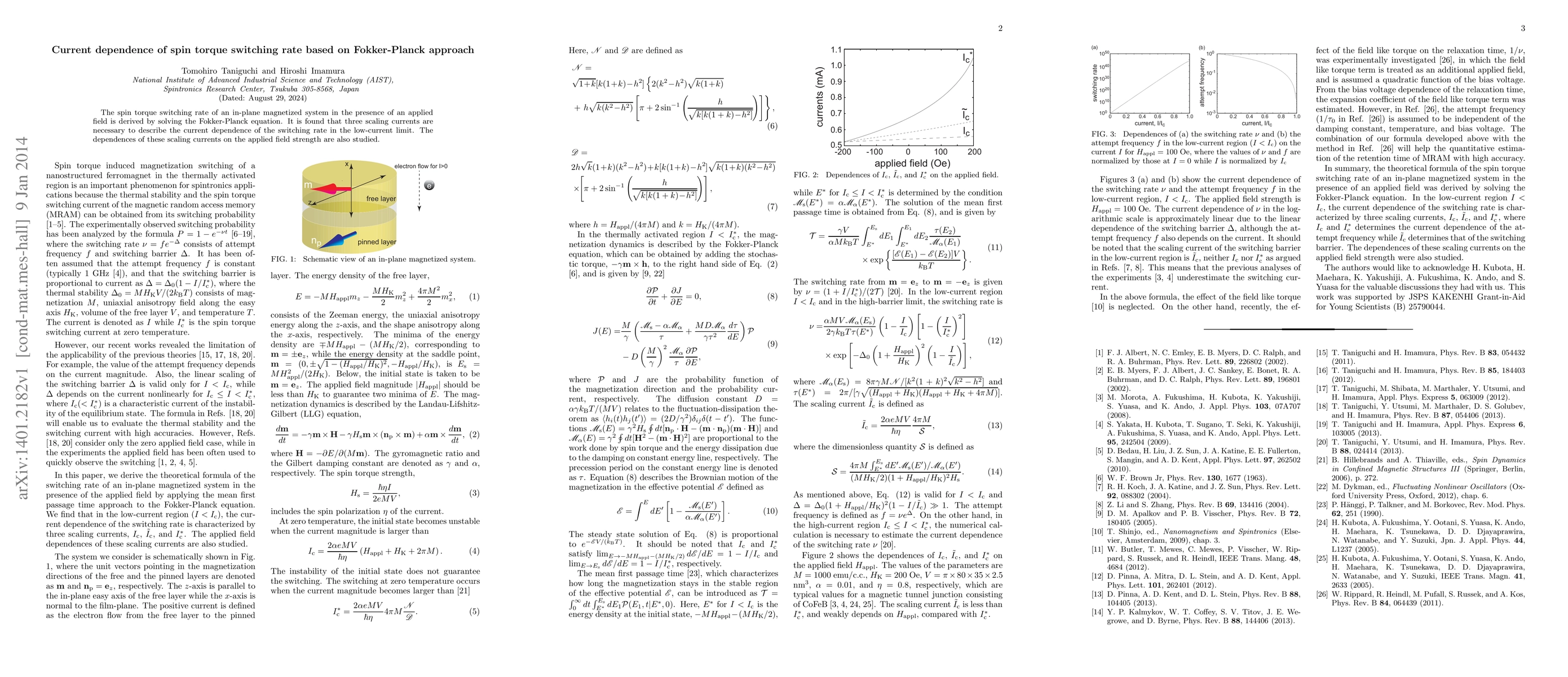 This paper derives the spin torque switching rate of an in-plane magnetized system using the Fokker-Planck equation, revealing that three scaling currents characterize the current dependence in low-current conditions, with their dependence on the applied field strength also analyzed.