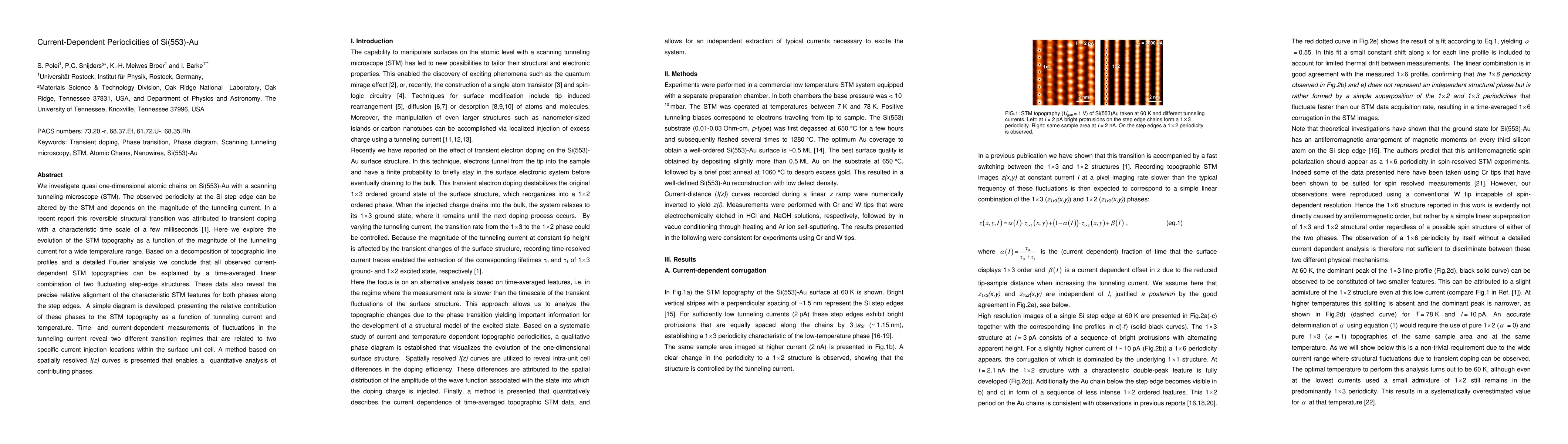 We investigate quasi one-dimensional atomic chains on Si(553)-Au with a scanning tunneling microscope (STM). The observed periodicity at the Si step edge can be altered by the STM and depends on the magnitude of the tunneling current. In a recent report this reversible structural transition was attributed to transient doping with a characteristic time scale of a few milliseconds. Here we explore the evolution of the STM topography as a function of the magnitude of the tunneling current for a wide temperature range. Based on a decomposition of topographic line profiles and a detailed Fourier analysis we conclude that all observed currentdependent STM topographies can be explained by a time-averaged linear combination of two fluctuating step-edge structures. These data also reveal the precise relative alignment of the characteristic STM features for both phases along the step edges. A simple diagram is developed, presenting the relative contribution of these phases to the STM topography as a function of tunneling current and temperature. Time- and current-dependent measurements of fluctuations in the tunneling current reveal two different transition regimes that are related to two specific current injection locations within the surface unit cell. A method based on spatially resolved I(z)curves is presented that enables a quantitative analysis of contributing phases.