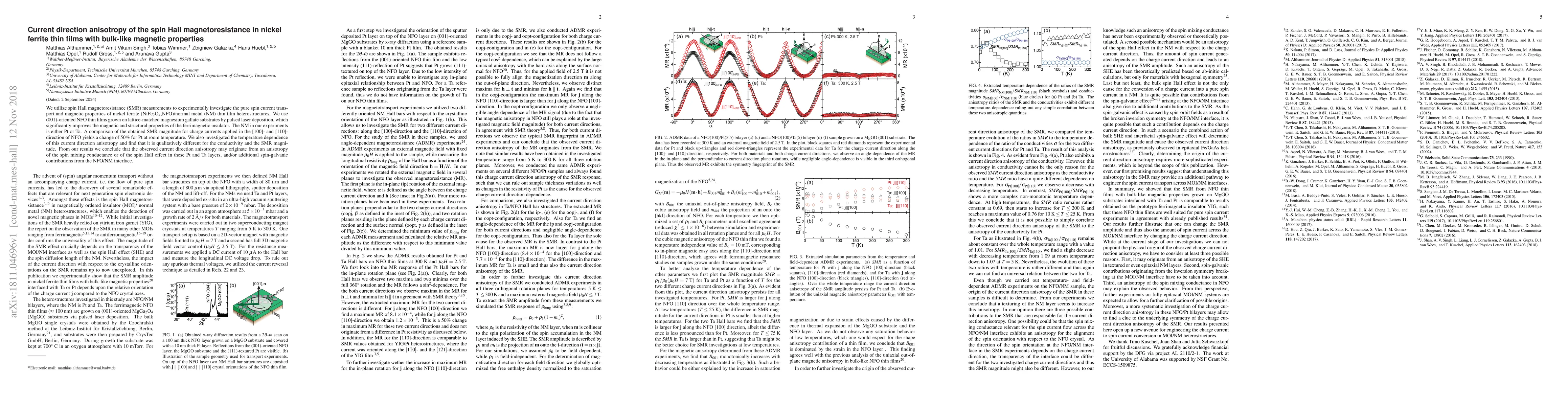 We utilize spin Hall magnetoresistance (SMR) measurements to experimentally investigate the pure spin current transport and magnetic properties of nickel ferrite (NiFe2O4,NFO)/normal metal (NM) thin film heterostructures. We use (001)-oriented NFO thin films grown on lattice-matched magnesium gallate substrates by pulsed laser deposition, which significantly improves the magnetic and structural properties of the ferrimagnetic insulator. The NM in our experiments is either Pt or Ta. A comparison of the obtained SMR magnitude for charge currents applied in the [100]- and [110]-direction of NFO yields a change of 50% for Pt at room temperature. We also investigated the temperature dependence of this current direction anisotropy and find that it is qualitatively different for the conductivity and the SMR magnitude. From our results we conclude that the observed current direction anisotropy may originate from an anisotropy of the spin mixing conductance or of the spin Hall effect in these Pt and Ta layers, and/or additional spin-galvanic contributions from the NFO/NM interface.