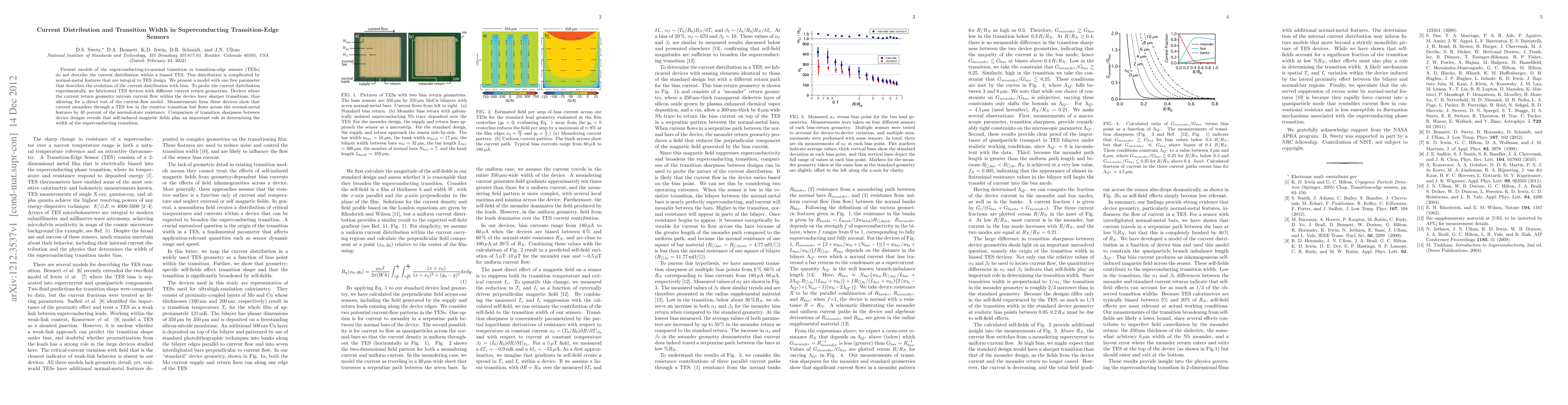 This paper proposes a new model to describe the current distribution in superconducting transition-edge sensors (TESs) and finds that self-induced magnetic fields significantly influence the transition width. Experimental results from devices with mirrored current return geometries show sharper transitions, validating the model's predictions.