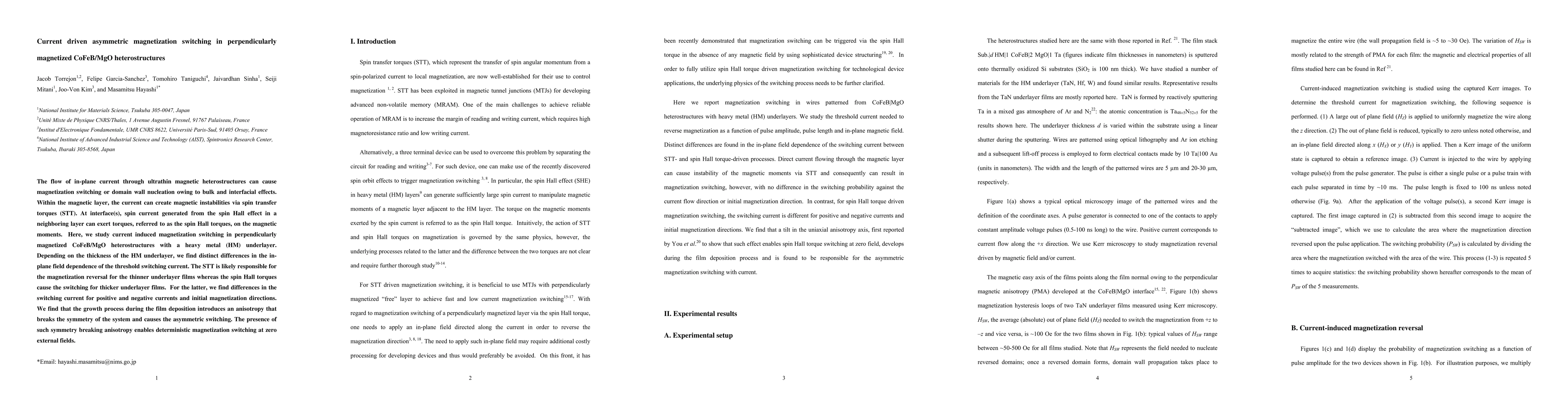 This paper investigates current-driven magnetization switching in CoFeB/MgO heterostructures with a heavy metal underlayer, finding that spin transfer torques dominate in thinner films while spin Hall torques dominate in thicker films. The asymmetric switching observed in the thicker films is attributed to an anisotropy introduced during the growth process, enabling deterministic switching at zero external fields.