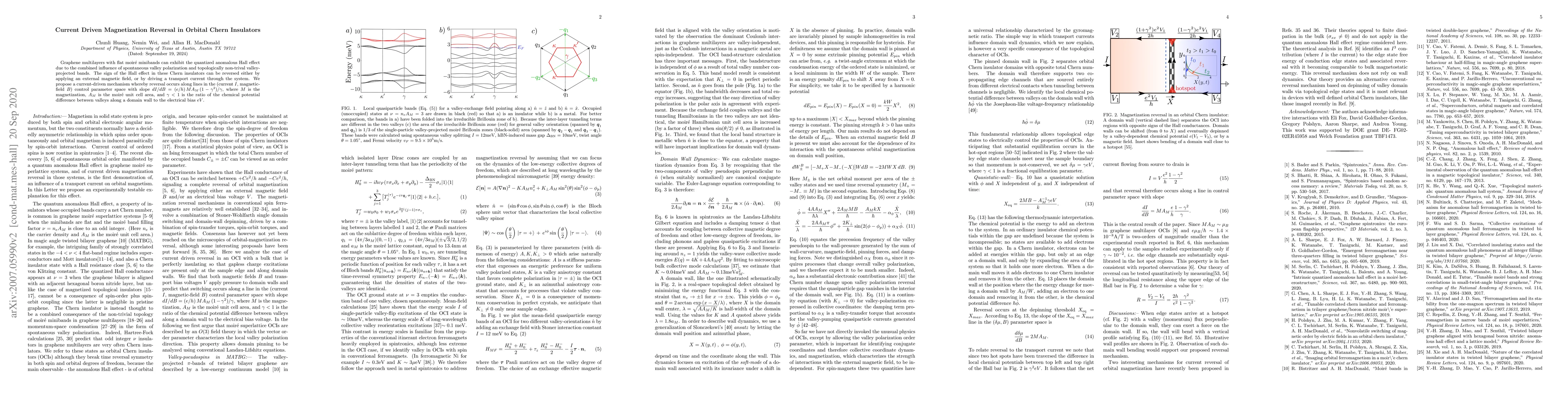 Graphene multilayers with flat moir\'e minibands can exhibit the quantized anomalous Hall effect due to the combined influence of spontaneous valley polarization and topologically non-trival valley-projected bands. The sign of the Hall effect in these Chern insulators can be reversed either by applying an external magnetic field, or by driving a transport current through the system. We propose a current-driven mechanism whereby reversal occurs along lines in the (current $I$, magnetic-field $B$) control parameter space with slope $dI/dB = (e/h)\, M A_{M} \, (1-\gamma^2)/\gamma$, where $M$ is the magnetization, $A_M$ is the moir\'e unit cell area, and $\gamma <1$ is the ratio of the chemical potential difference between valleys along a domain wall to the electrical bias $eV$.