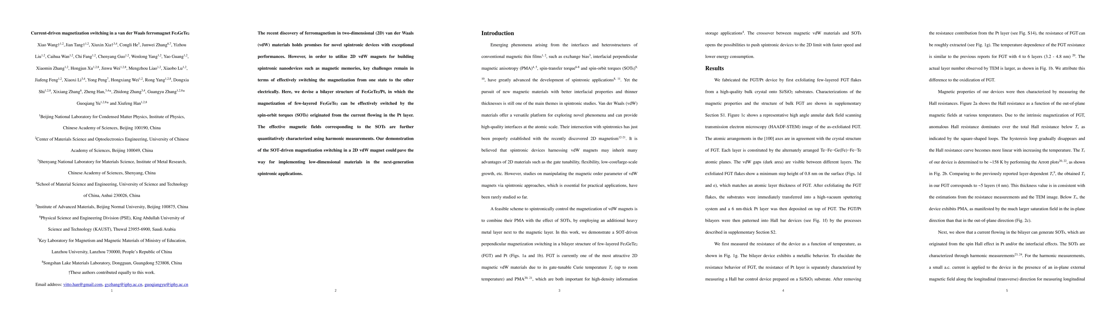 This paper investigates the current-driven magnetization switching in a bilayer structure of Fe3GeTe2/Pt, demonstrating that spin-orbit torques from a Pt layer can effectively switch the magnetization in few-layered Fe3GeTe2. The study uses harmonic measurements to characterize the effective magnetic fields, highlighting potential applications for 2D van der Waals magnets in next-generation spintronic devices.