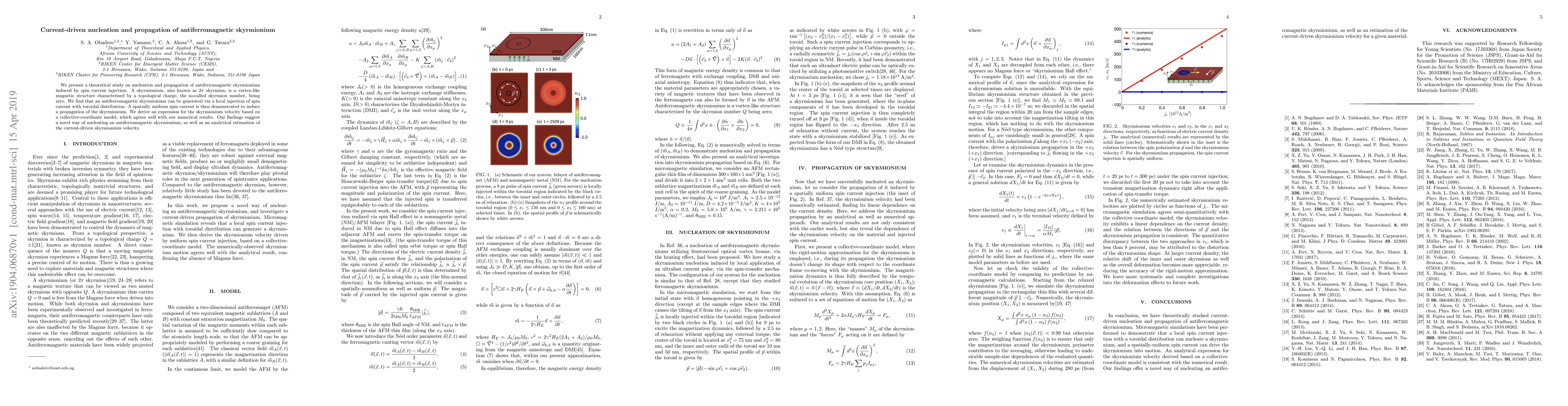 This research investigates the generation and movement of antiferromagnetic skyrmionia via spin current injection, demonstrating that a toroidal spin current can nucleate these structures while a uniform spin current drives their propagation. The study provides a theoretical model for the skyrmionium velocity that aligns with numerical simulations.