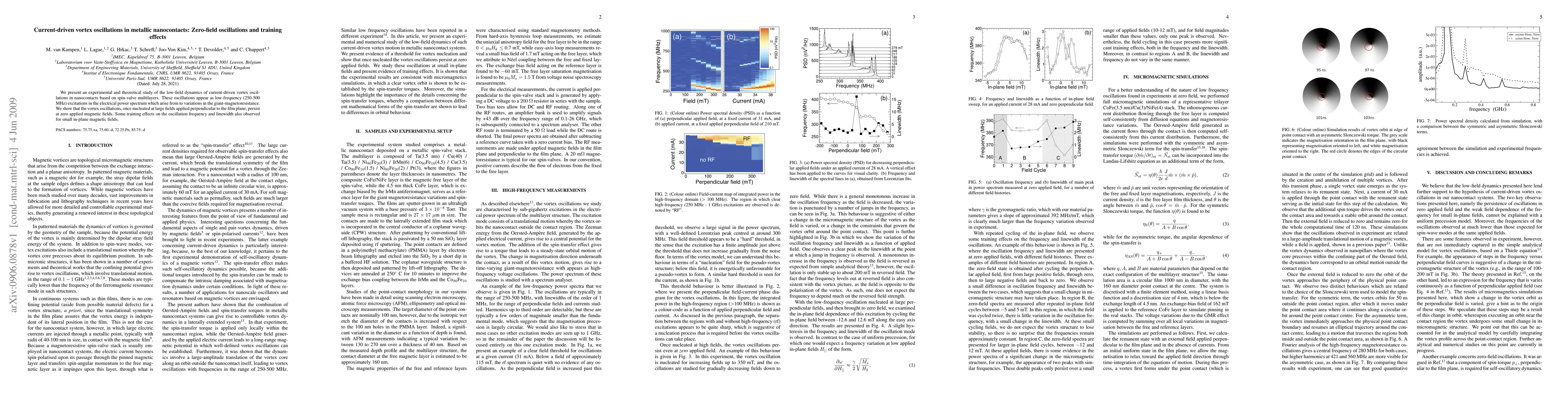 This paper investigates current-driven vortex oscillations in metallic nanocontacts, revealing low-frequency excitations (250-500 MHz) from variations in giant-magnetoresistance. The study finds that these oscillations persist at zero magnetic fields and exhibits training effects on frequency and linewidth under small in-plane fields.