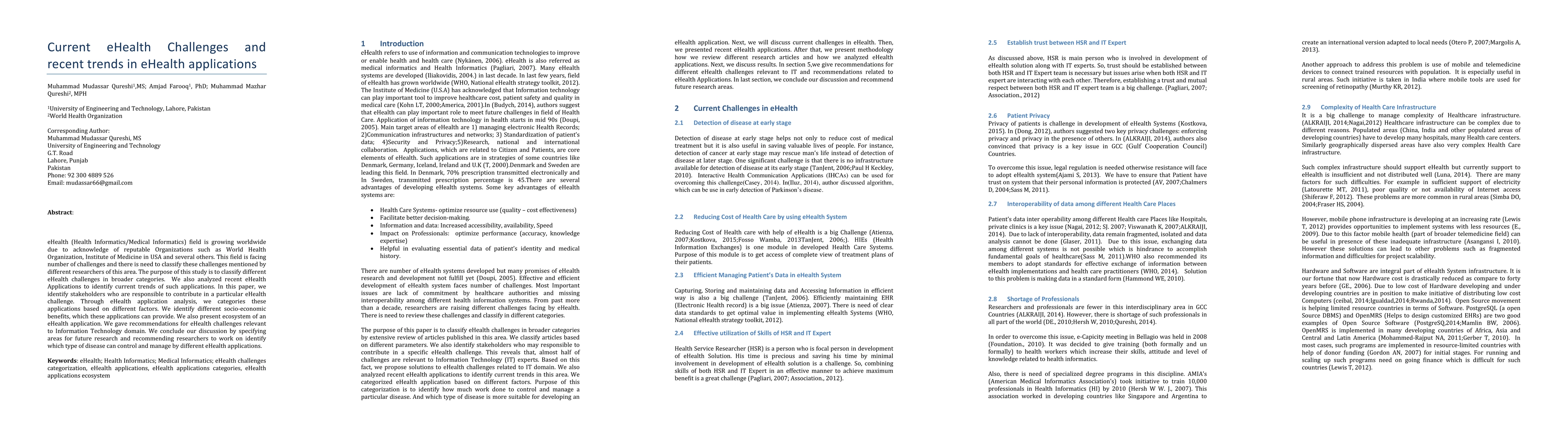 This paper classifies various eHealth challenges into broader categories and analyzes recent trends in eHealth applications. It identifies stakeholders responsible for addressing these challenges and categorizes applications based on socio-economic benefits, presenting an ecosystem model. Recommendations for Information Technology domain and future research directions are provided.