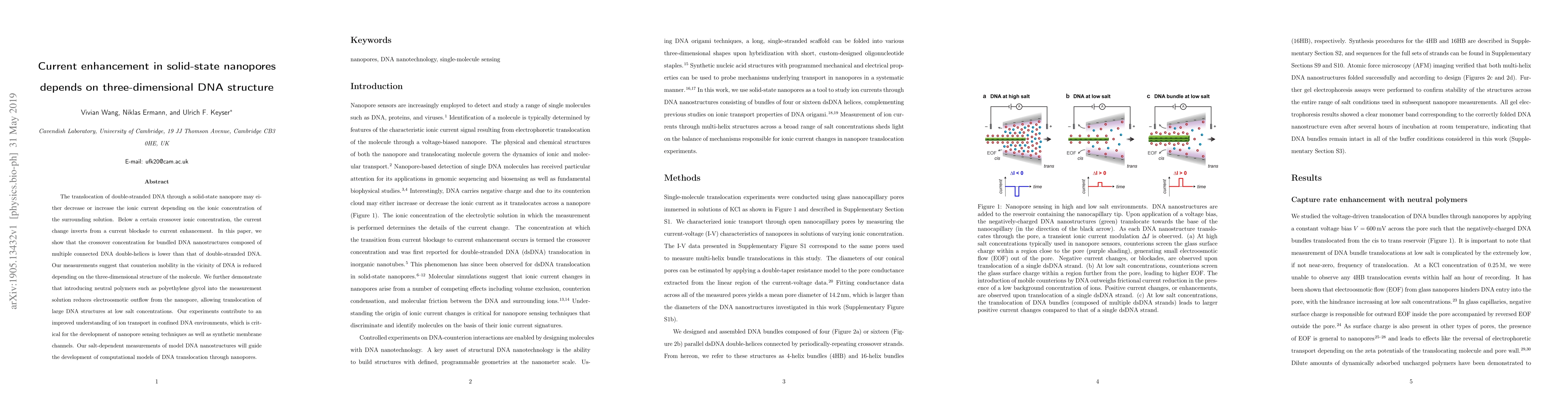 This paper investigates how the three-dimensional structure of DNA affects ionic current changes during its translocation through solid-state nanopores, revealing that bundled DNA structures exhibit lower crossover ionic concentrations for current enhancement compared to single double-stranded DNA. The study also shows that neutral polymers can facilitate DNA translocation at low salt concentrations.