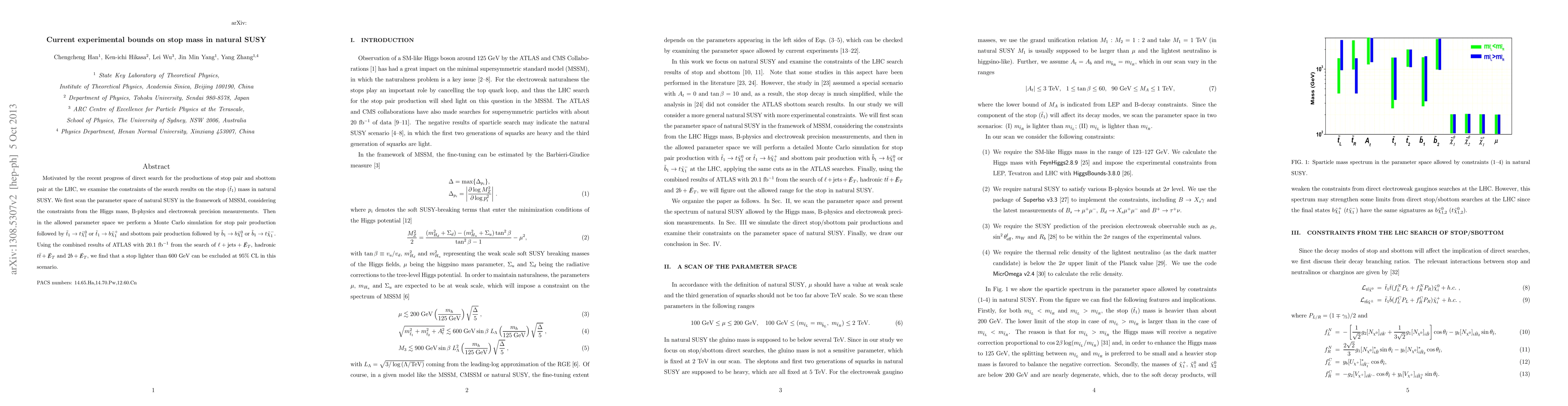 This paper examines experimental constraints on the stop mass in natural SUSY, finding that a stop lighter than 600 GeV can be excluded at 95% confidence level using LHC data. The study combines MSSM framework with Monte Carlo simulations and recent ATLAS results.