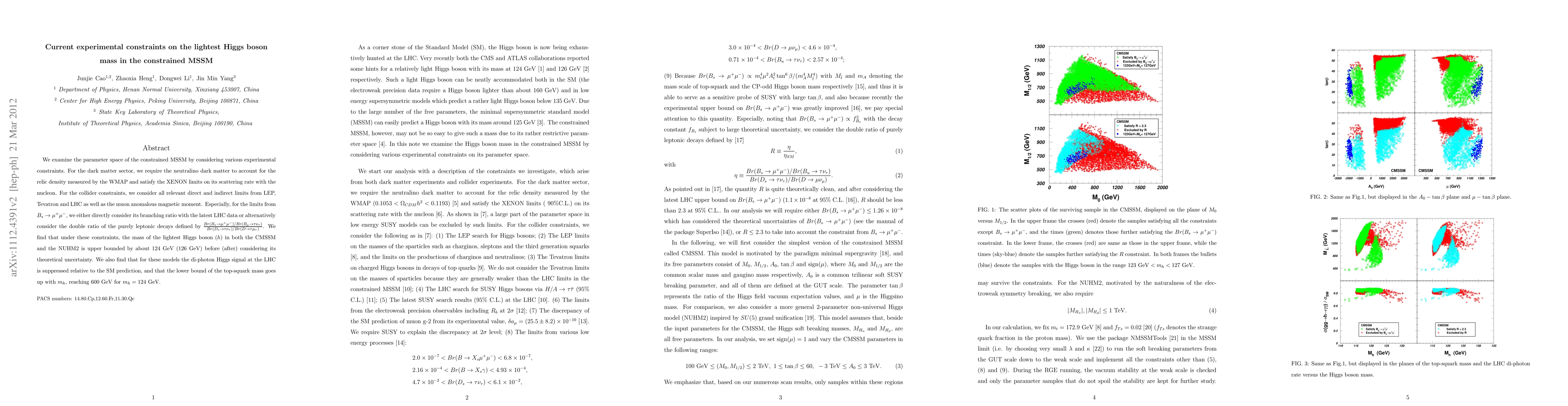 We examine the parameter space of the constrained MSSM by considering various experimental constraints. For the dark matter sector, we require the neutralino dark matter to account for the relic density measured by the WMAP and satisfy the XENON limits on its scattering rate with the nucleon. For the collider constraints, we consider all relevant direct and indirect limits from LEP, Tevatron and LHC as well as the muon anomalous magnetic moment. Especially, for the limits from B_s->\mu^+\mu^-, we either directly consider its branching ratio with the latest LHC data or alternatively consider the double ratio of the purely leptonic decays defined by [Br(B_s->\mu^+\mu^-)/Br(B_u->\tau \nu_\tau)]/[Br(D_s->\tau \nu_\tau)/Br(D->\tau \mu_\tau)]. We find that under these constraints, the mass of the lightest Higgs boson (h) in both the CMSSM and the NUHM2 is upper bounded by about 124 GeV (126 GeV) before (after) considering its theoretical uncertainty. We also find that for these models the di-photon Higgs signal at the LHC is suppressed relative to the SM prediction, and that the lower bound of the top-squark mass goes up with m_h, reaching 600 GeV for m_h=124 GeV.