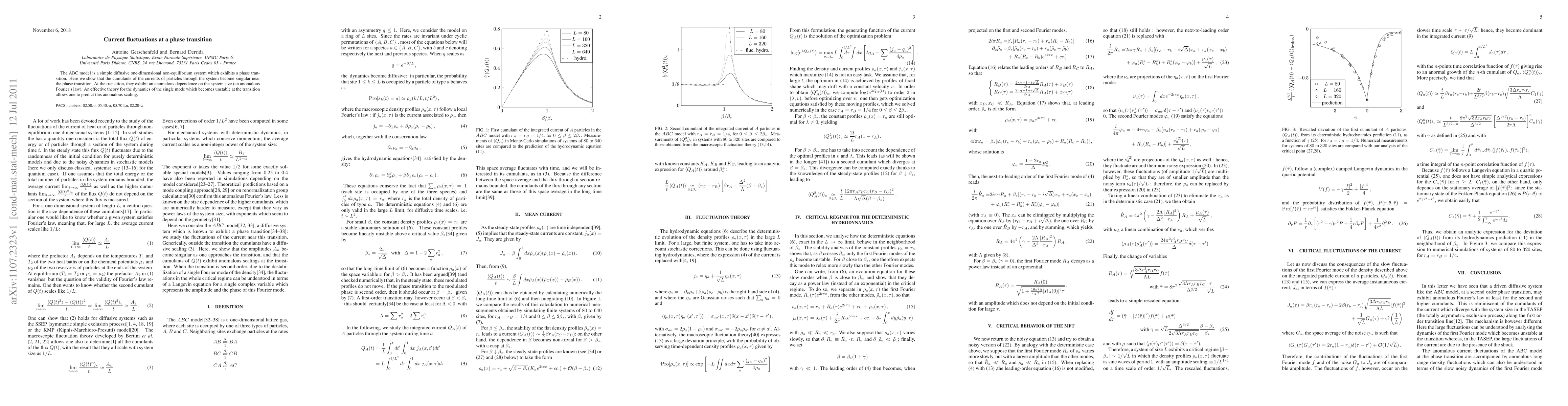 Research shows that fluctuations in particle currents become singular at a phase transition in the ABC model, exhibiting anomalous behavior near the transition point. This phenomenon is predicted to scale with system size, suggesting an effective theory for the unstable mode.