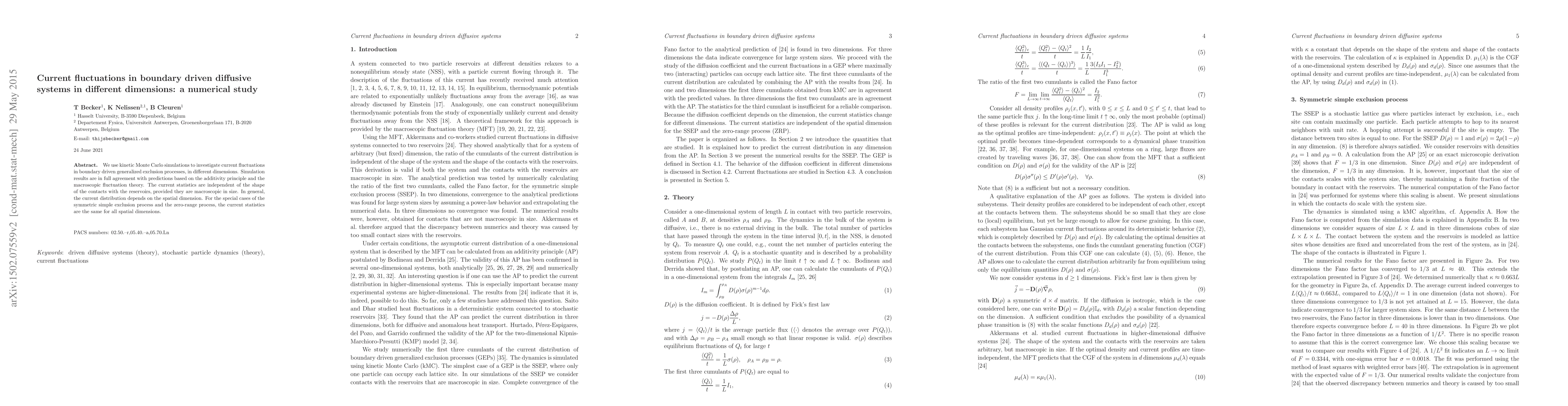 This study uses kinetic Monte Carlo simulations to explore current fluctuations in boundary-driven diffusive systems across different dimensions, confirming predictions from the additivity principle and macroscopic fluctuation theory. The current distribution is dimension-dependent in general but identical for symmetric simple exclusion and zero-range processes across dimensions.