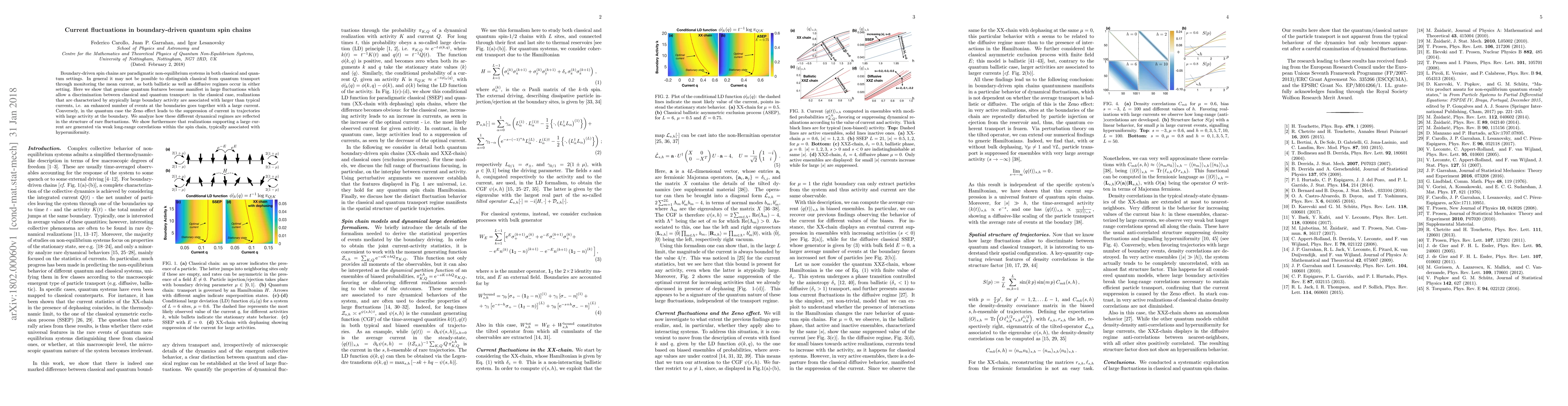 This paper investigates current fluctuations in boundary-driven quantum spin chains, demonstrating that quantum systems exhibit unique large fluctuations compared to classical ones, where enhanced boundary activity correlates with larger currents. Quantum transport features, such as the Zeno effect, suppress current in active boundary trajectories, revealing distinct dynamical regimes through the structure of rare fluctuations.